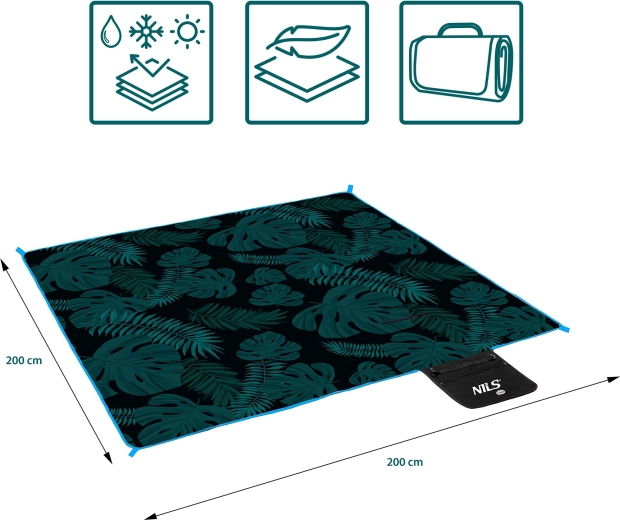 A NILS Camp Leaves piknikpléd bőséges helyet kínál a családnak és barátoknak. Stílusos, természetes mintája remekül illik a kültéri környezethez, és kényelmes helyet biztosít pihenésre, frissítőzésre és játékra. A háromrétegű felépítés puha polárt, habszivacs bélést és alumínium bevonatú alsó réteget kombinál a megbízható védelemért a hideg és a nedvesség ellen.