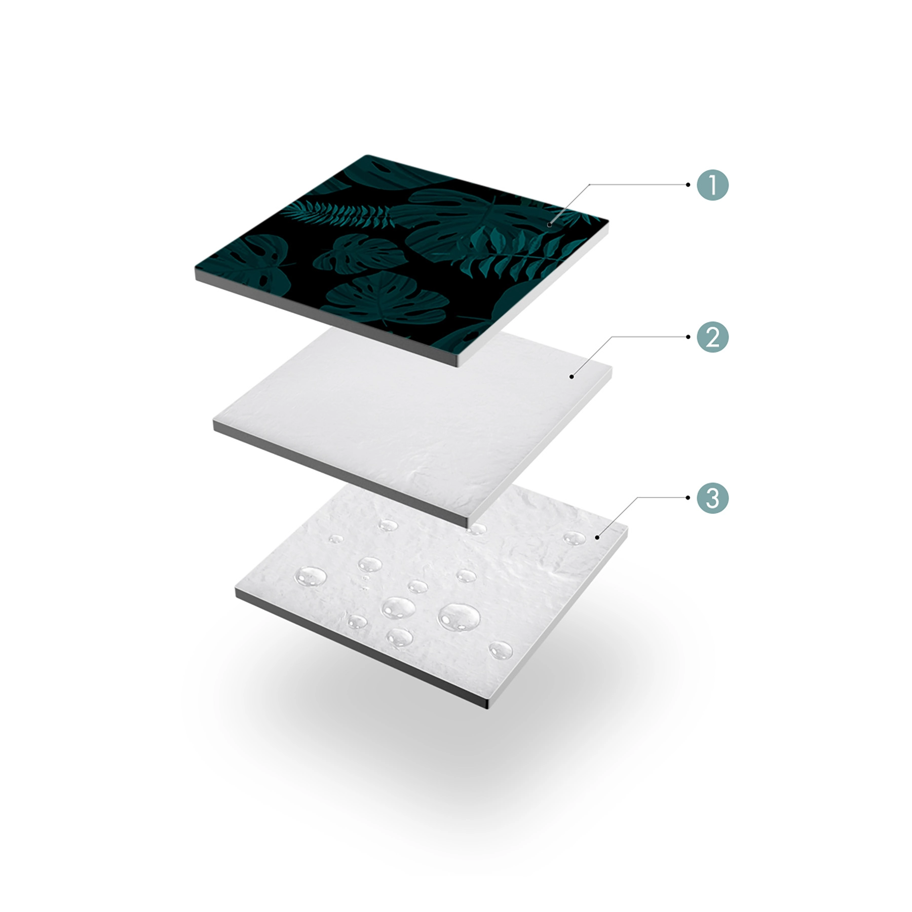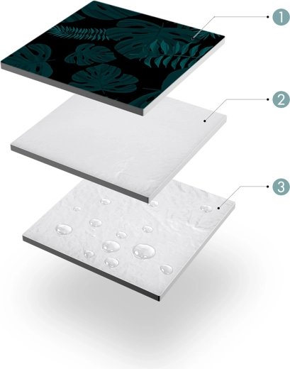 Polár + 2 mm hab + PE fólia alumínium bevonattal – megbízhatóan szigetel a nedves vagy hideg talajtól. A sarkokban rögzítőfülek találhatók, a leszúró tüskék a csomagban vannak.