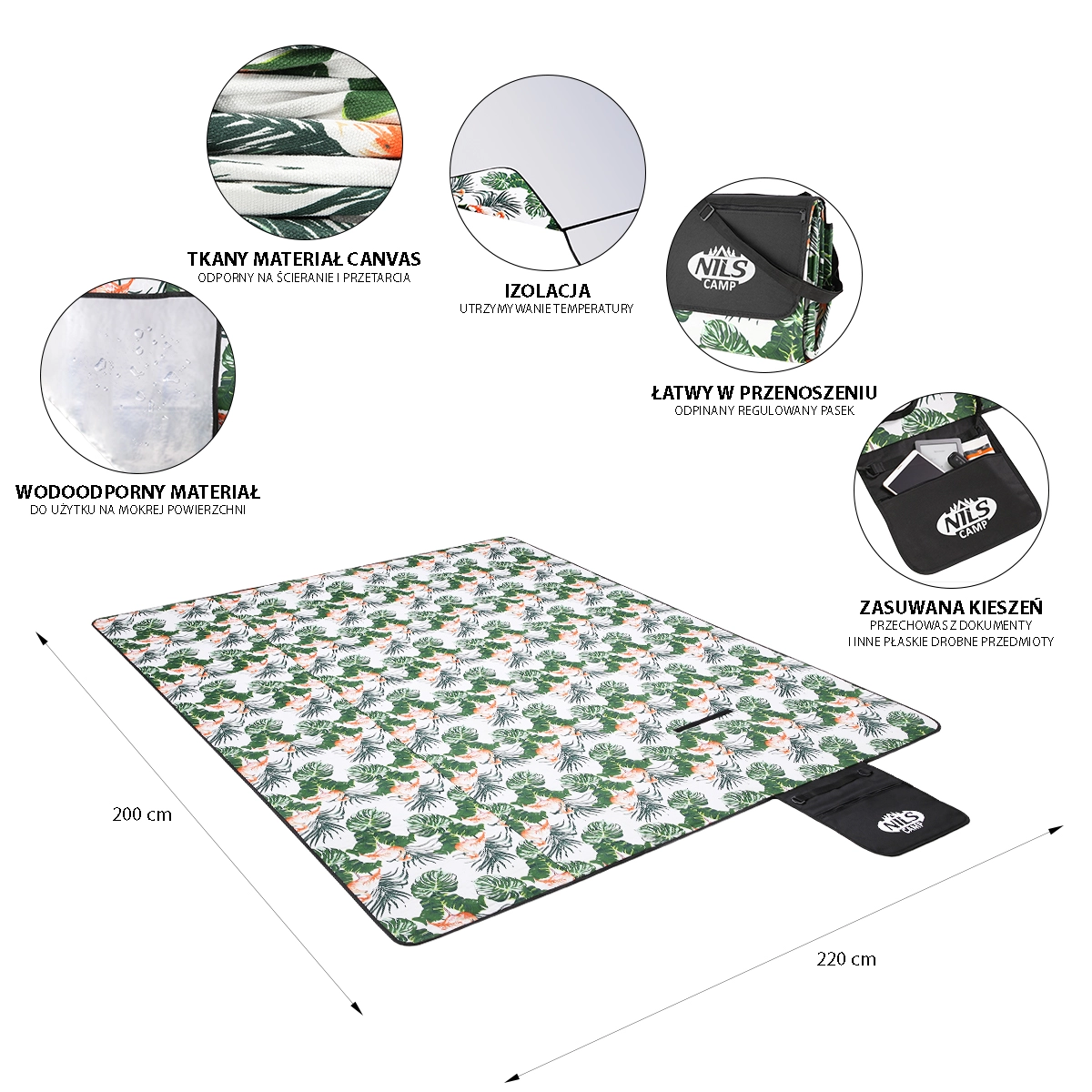 Ez a sokoldalú piknikpléd kényelmes ülésre és fekvésre készült bármilyen felületen. A felső oldal puha és tartós vászonhatású anyagból áll, míg az alsó oldal vízálló bevonatú alumínium fólia, amely megbízhatóan szigetel a nedves fűtől és a hideg talajtól. A 200 × 220 cm-es méretnek köszönhetően az egész család számára elegendő helyet biztosít.