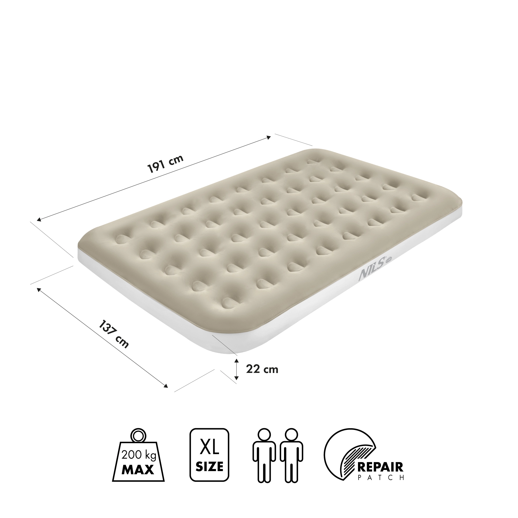 A NILS Camp felfújható matrac remek választás vendégágyként otthonra és kényelmes fekhelyként sátorba. A 191 × 137 × 22 cm-es méret a standard franciaágy méretének felel meg, így kényelmesen elfér rajta két személy, vagy extra helyet ad egy főnek. A 22 cm-es magasság hatékony szigetelést nyújt a hideg és az egyenetlen talaj ellen, valamint kellemes kényelmet biztosít alvás közben.