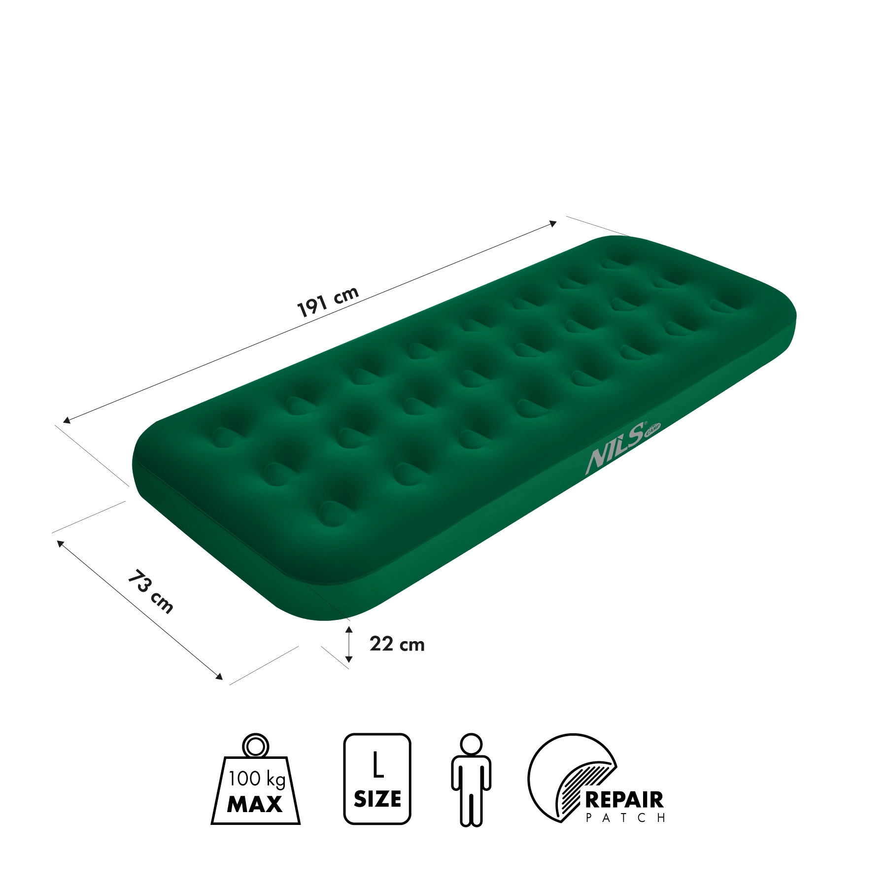 A NILS Camp könnyű és tartós felfújható matraca otthoni használatra és kempingezéshez egyaránt maximális kényelmet, kopásálló erős PVC-t, csúszásmentes felületet, valamint dupla szelepet kínál a gyors felfújáshoz. A 22 cm magasság jobb szigetelést és kényelmet biztosít, a 120 kg teherbírás és az összecsomagolva kompakt méretek megkönnyítik a szállítást és a tárolást.