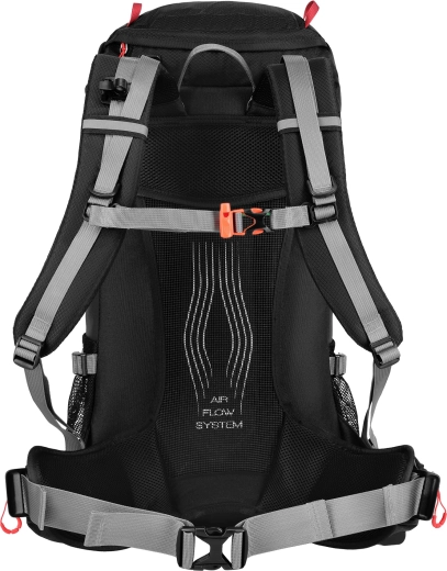 A fejlett Air Flow System elválasztja a hátat a terheléstől és folyamatos légáramlást biztosít – ideális forró napokra és dinamikus mozgás közben. A levehető hátpanel acél vázzal segít jobb tehermegosztást elérni és megkönnyíti a hátizsák karbantartását. A fröccsenő víznek ellenálló anyagot esőhuzat egészíti ki erős eső esetére, így a felszerelés száraz marad.