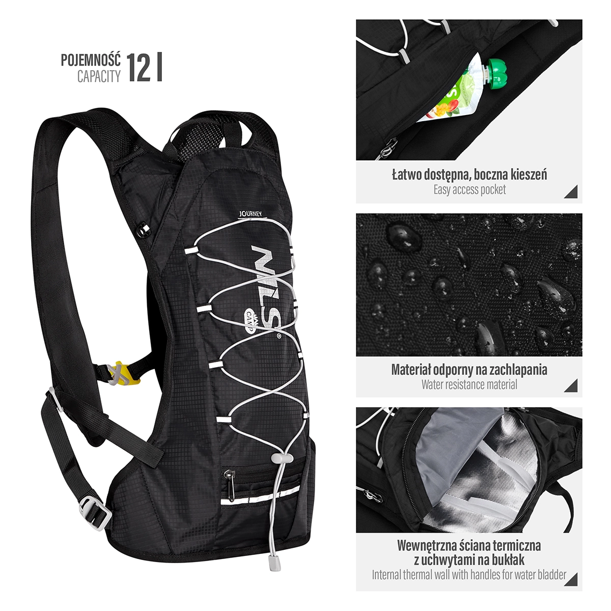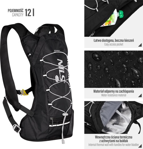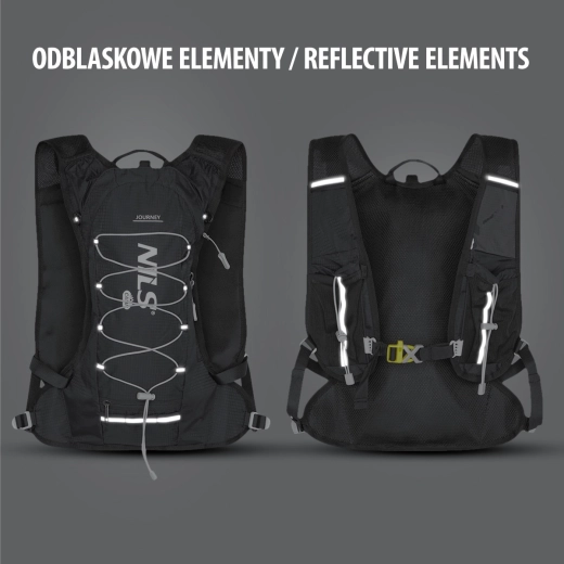 A NILS Camp Journey egy kompakt, 12 literes hátizsák, amelyet kényelmes mozgásra terveztek terepen. A strapabíró, ripstop szerkezetű nylon ellenáll a kopásnak és fröccsenő víznek. A fő rekesz elválasztóval és ivótasak-rögzítéssel van ellátva, a hátrészben lévő alumíniumfólia pedig tovább hidegen tartja az italt.