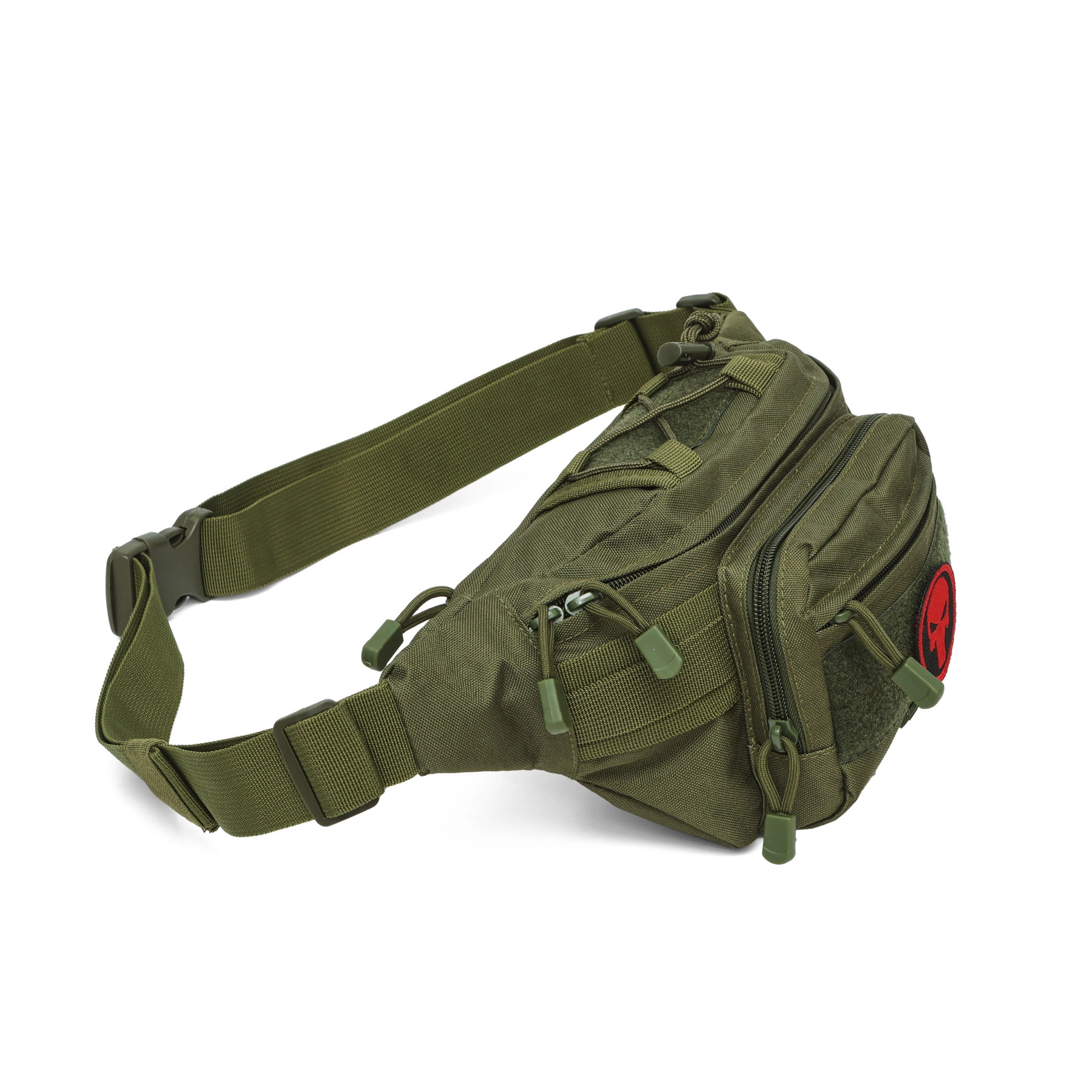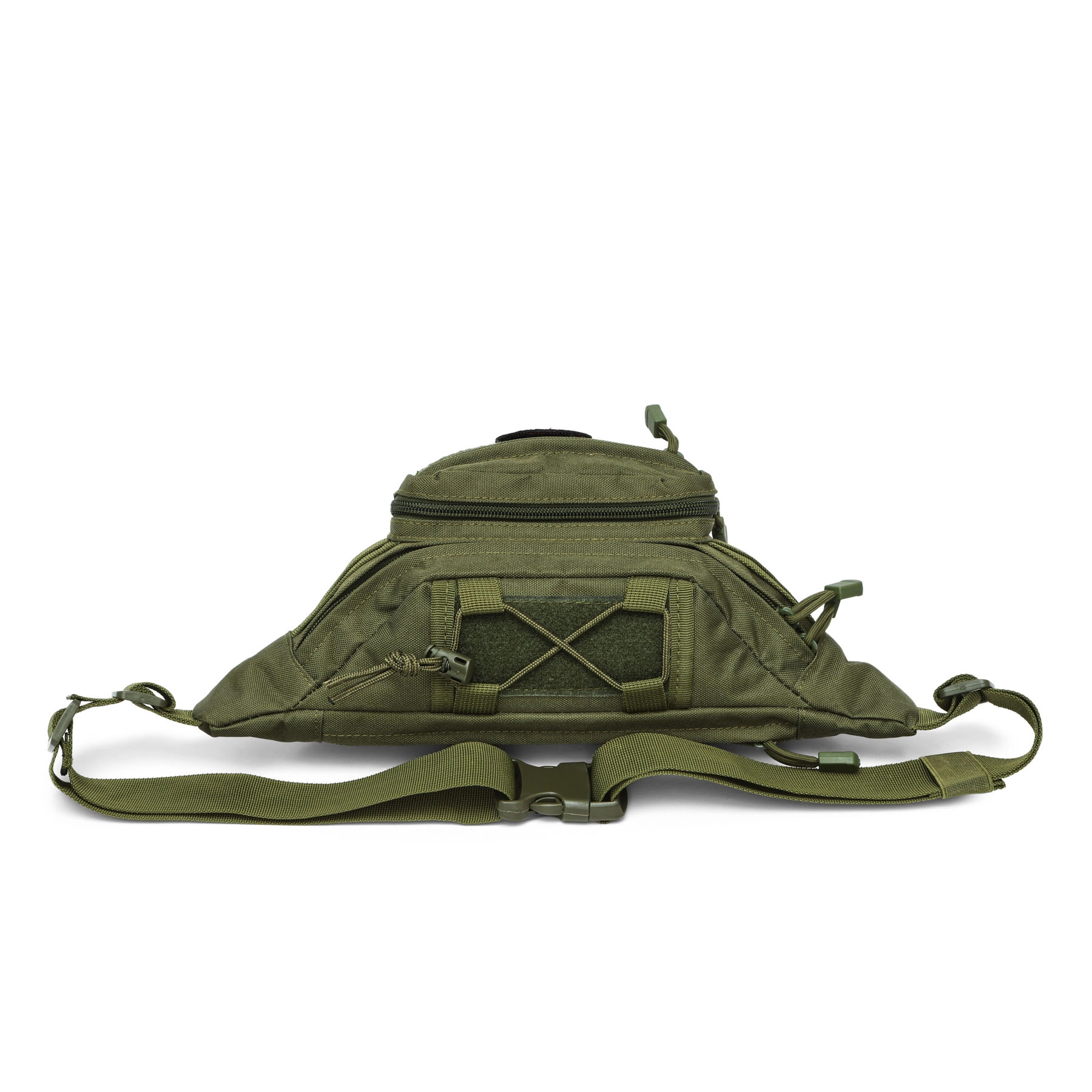 Több cipzáras zseb, MOLLE-stílusú elemek és elülső tépőzáras panel a felvarrókhoz – átlátható tárolás és egyedi stílus (a felvarrók nem tartozékok).