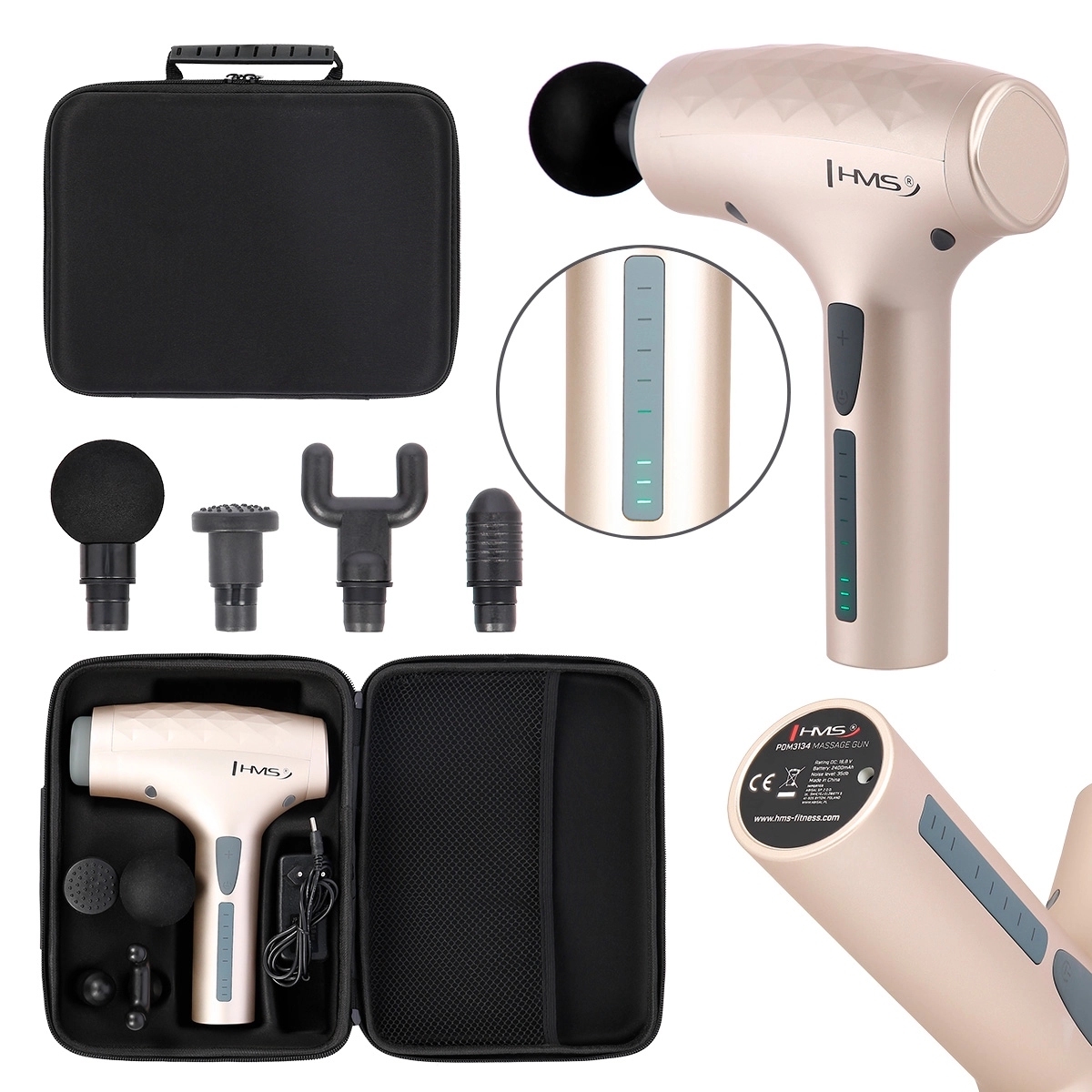 A csomagban 4 masszázsfej található a különböző izomcsoportok célzott kezeléséhez: gömb a univerzális masszázshoz, villa a gerinc környékére és a hosszú izmokra, lapos fej a nagy izmok mélyebb ellazításához, valamint kúpos fej a tapadások és a csontok közeli területeinek precíz munkájához. A pisztoly elegáns hordtáskában érkezik az egyszerű szállításhoz és biztonságos tároláshoz.