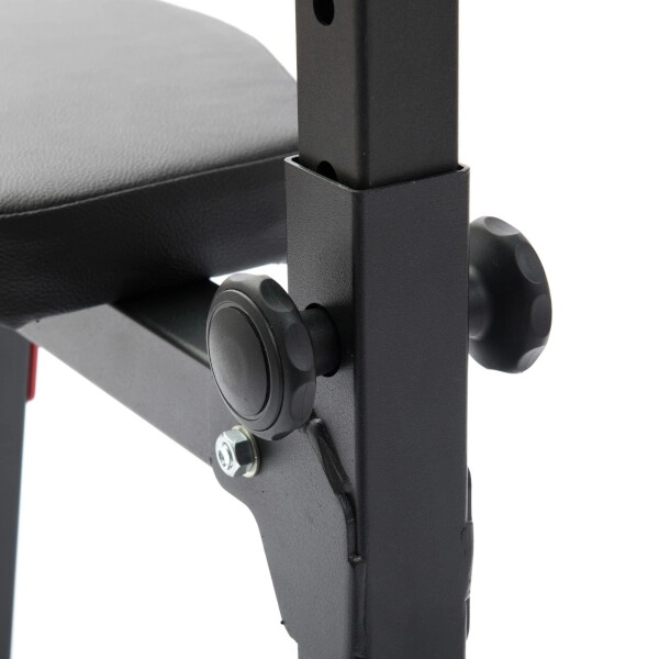 Az ergonomikusan formázott, minőségi szintetikus bőrből készült párnázás dupla varrással kényelmet nyújt még megterhelő edzések során is. A durva védőgumival ellátott lerakó kampók minimalizálják a zajt és megakadályozzák a rúd és a szerkezet karcolódását. A porszórt felületkezelés védi a vázat a kopástól és a korróziótól, a gumitalpak pedig biztosan a helyén tartják a padot anélkül, hogy megsértenék a padlót.