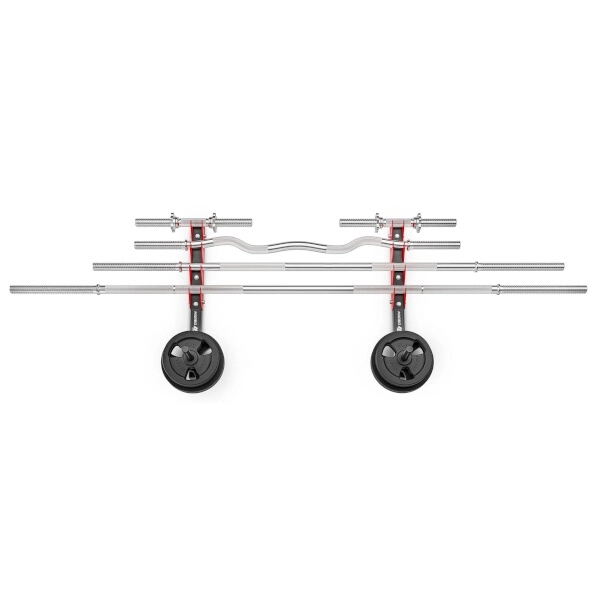 A két profil egyenként négy rögzítési ponttal szerelhető a falra (a rögzítőanyag nem része a csomagnak – a fal anyagának megfelelő típust válaszd). A telepítés után 4 pár tartót a rudakhoz kapsz (akár 4 kétkezes rúd vagy akár 8 egykezes rúd számára) és 2 tüskét a tárcsáknak, 21 cm hosszúsággal és 2,5 cm átmérővel. Ideális megoldás otthoni edzőtermekbe, ahol a rend, biztonság és helytakarékosság a prioritás.