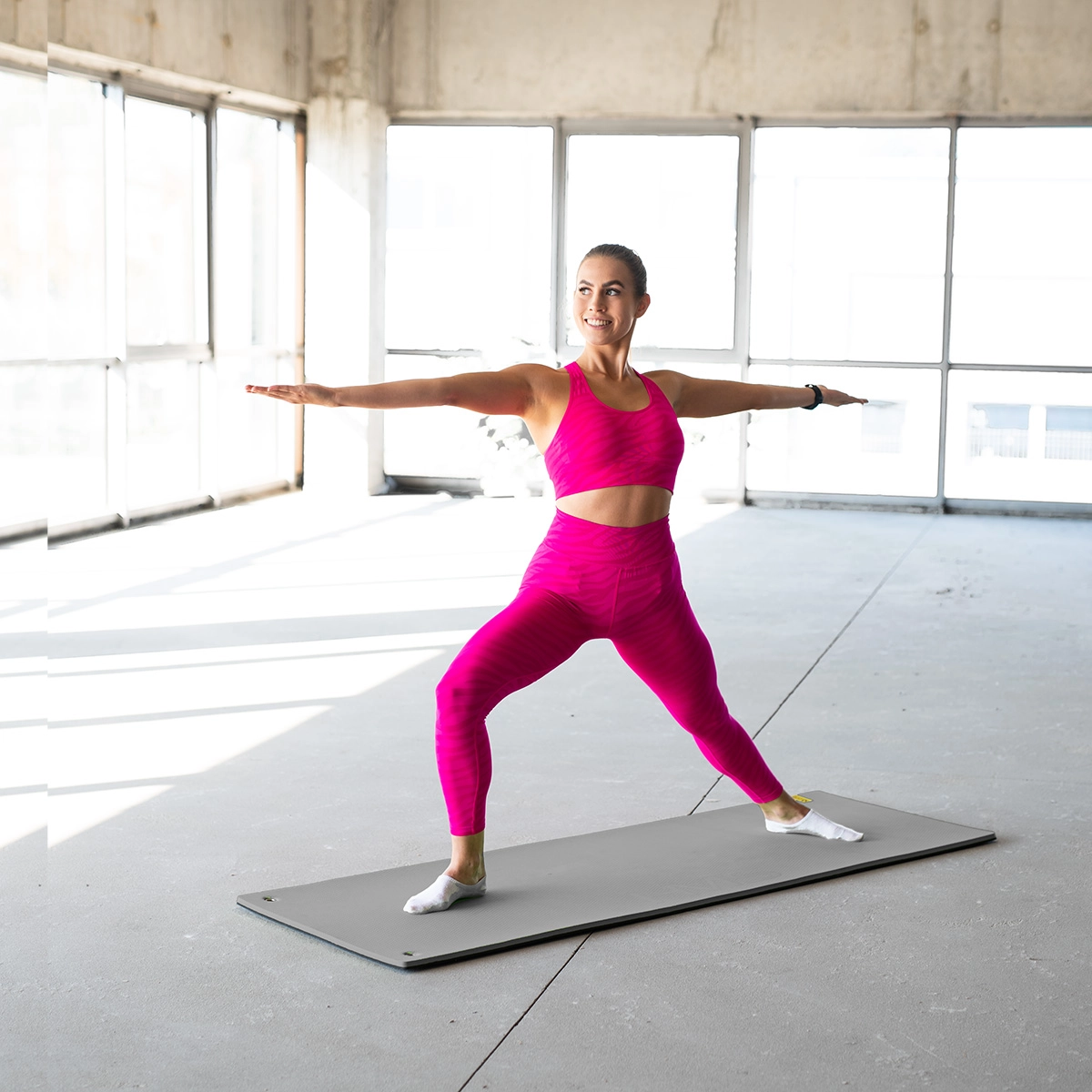 A texturált felső felület és a tapadós alsó réteg a helyén tartja a szőnyeget, hogy a mozgás magabiztos és biztonságos legyen még dinamikus edzés közben is.