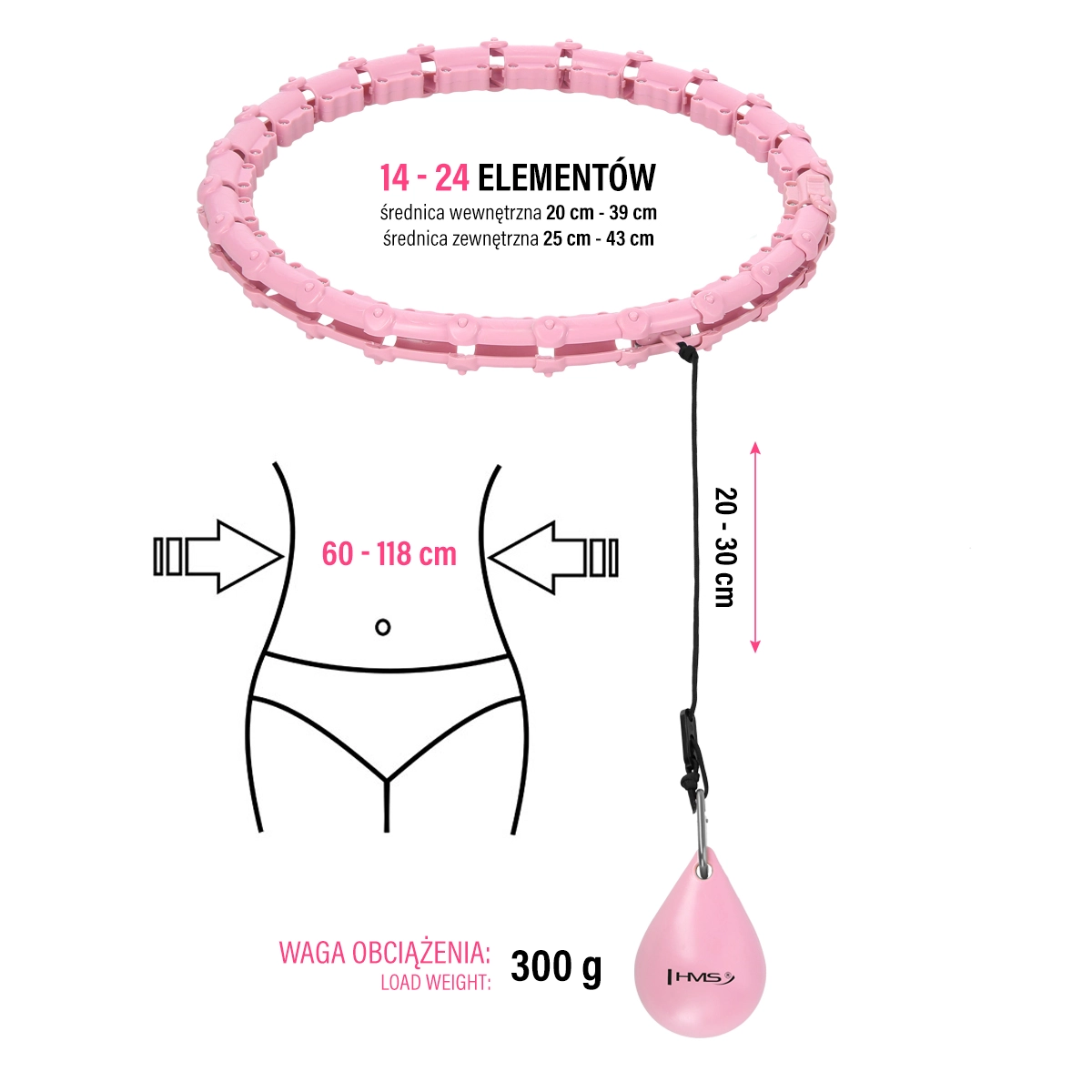 A HMS HHW02 modern hullahopp karika állítható hosszal és 300 g tömegű forgó súllyal, amely növeli az edzés intenzitását. A 24 részből álló, szétszedhető felépítés lehetővé teszi a derékbőség egyszerű beállítását (60–118 cm). A belső masszázs felületek kellemesen stimulálják a has és a derék területét, miközben a folyamatos mozgás csökkenti a hát és a csípő terhelését.