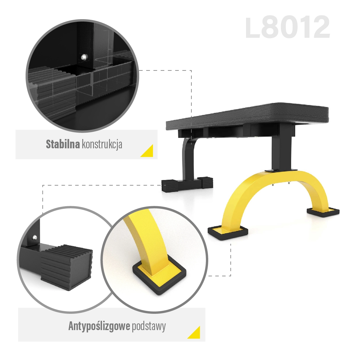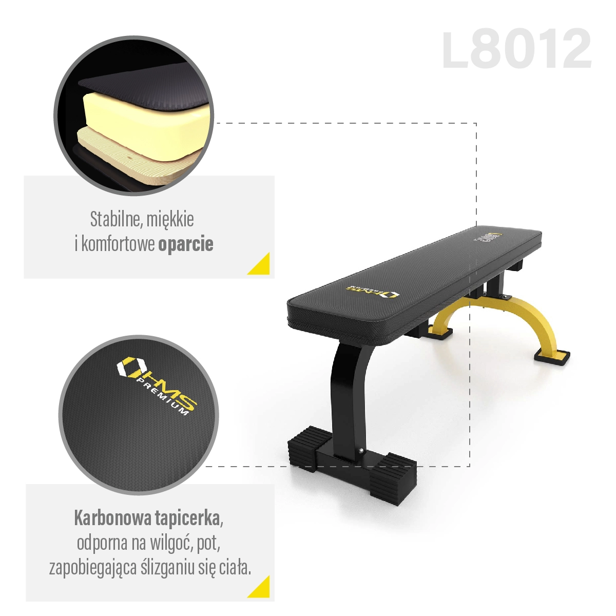 A HMS Premium L8012 egyenes pad univerzális pad otthoni edzéshez, alkalmas súlyzókkal, rudakkal és saját testsúllyal végzett gyakorlatokra. Masszív felépítést, 200 kg teherbírást, kényelmes, vastag párnázást és szélesített stabilizátort kínál a maximális stabilitásért még nehéz sorozatoknál is.