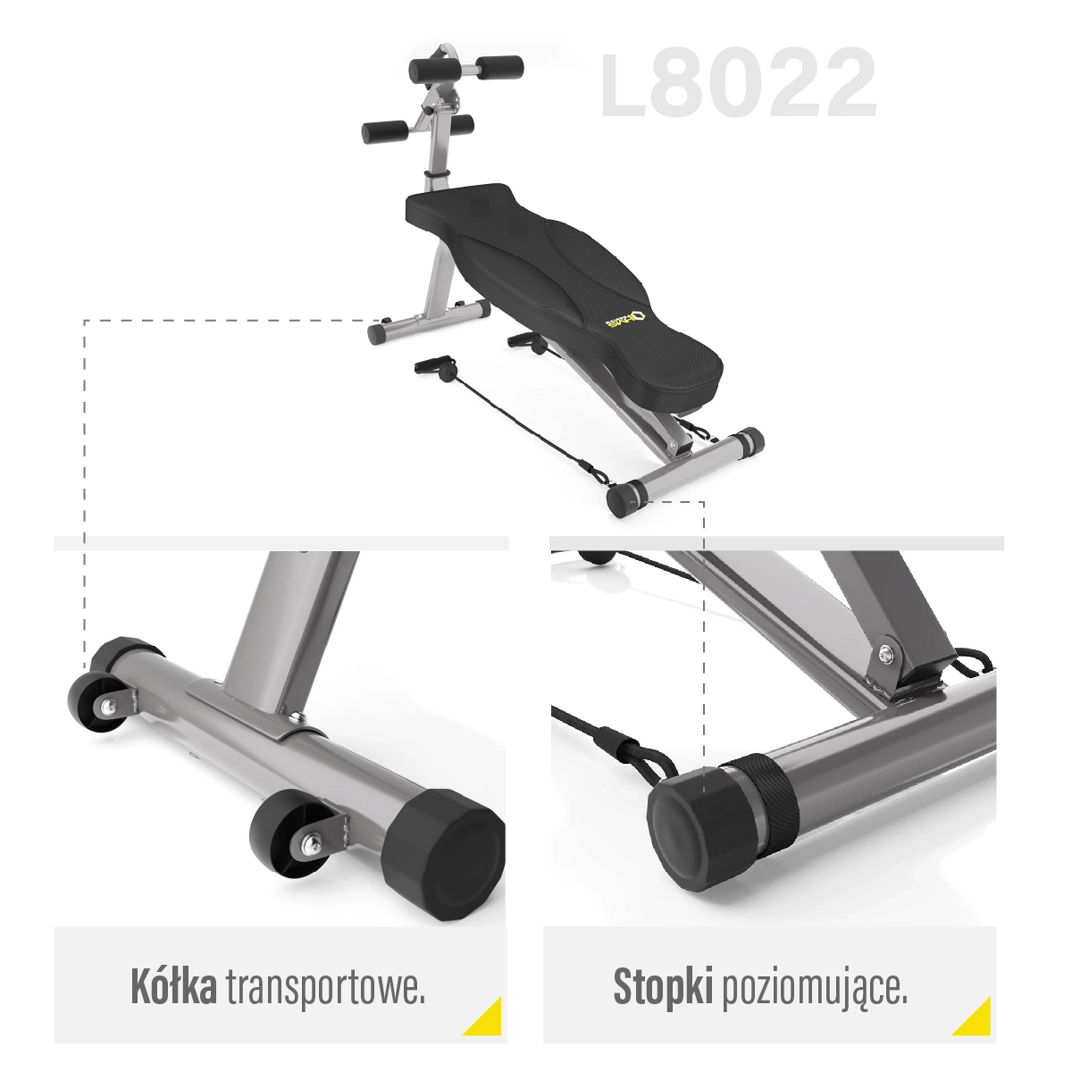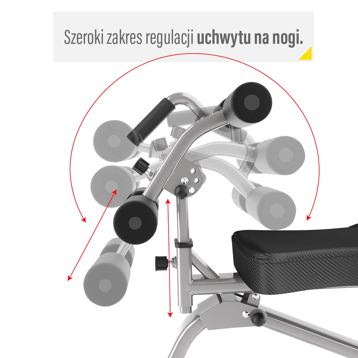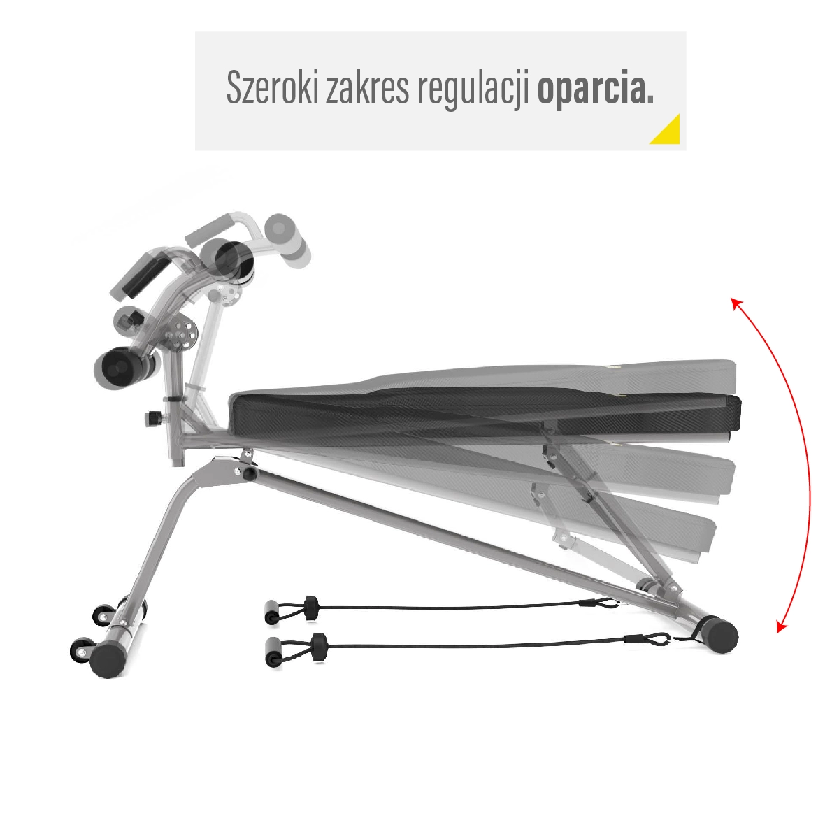 A kihúzható keret ütközőkkel pontosan a testalkatodhoz igazítható – állítható a szög 4 fokozatban, a magasság 3 fokozatban és a lábütköző távolsága 3 pozícióban. Az ergonomikus, karbon hatású műbőr kárpitozás izzadságálló és minimalizálja a csúszást. A két mellékelt expander bővíti az edzéslehetőségeket alap húzó- és nyomógyakorlatokkal, míg a szállítókerekek megkönnyítik a mozgatást.