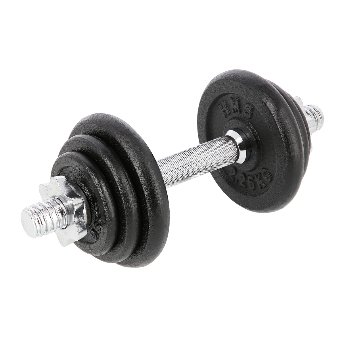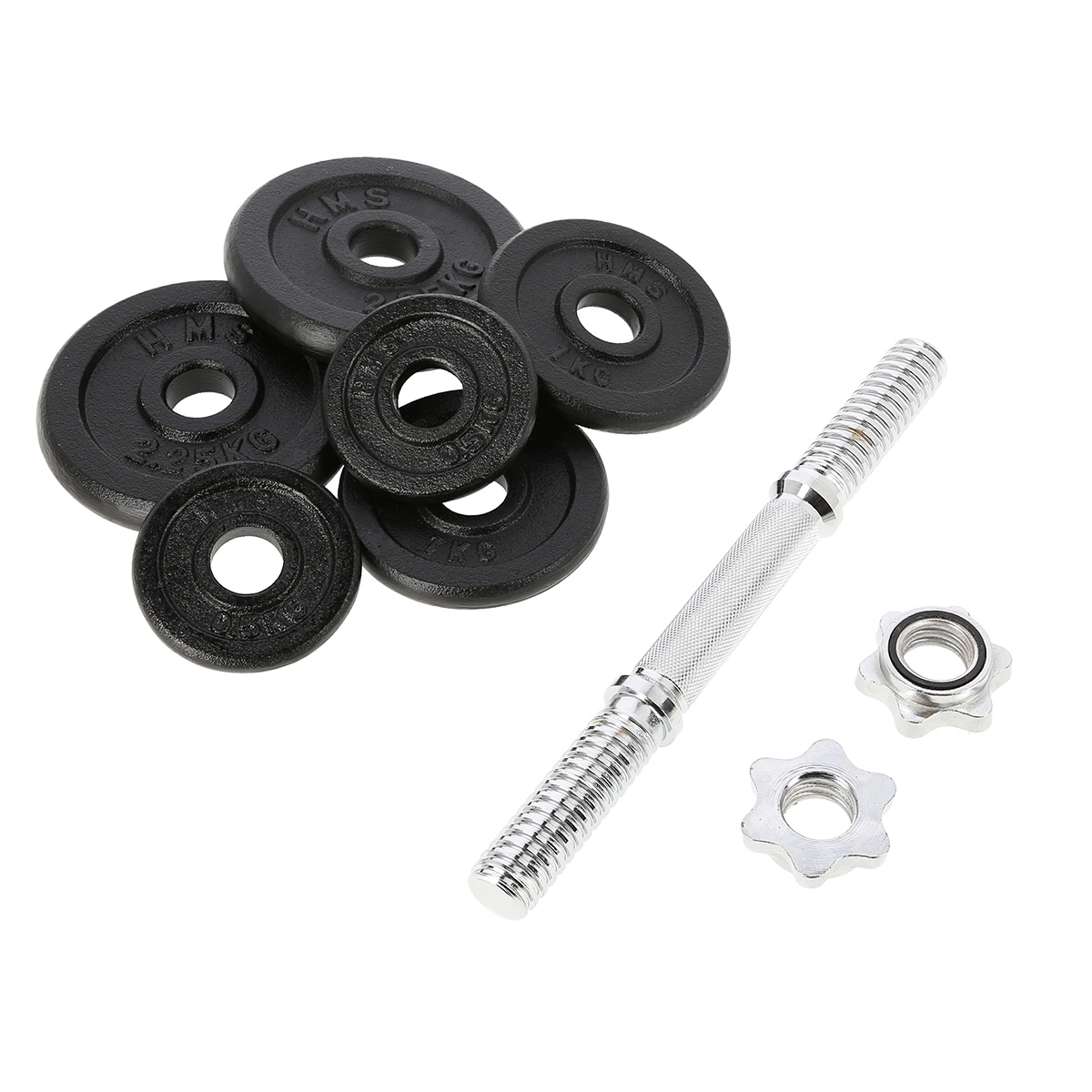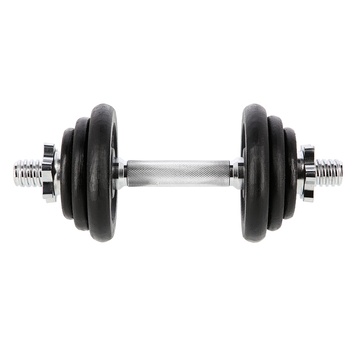 A súlyzó ideális bicepszgyakorlatokhoz, nyomásokhoz, tricepszhez és vállhoz. A 35 cm hosszú, 30 mm átmérőjű menetes rúd lehetővé teszi a súlykombinációk egyszerű cseréjét, és az ellenállás céljaidhoz igazítását. A csillag (spin-lock) anyák gumicsíkkal szilárdan a helyükön tartják a tárcsákat, és megakadályozzák a kilazulásukat az edzés során.