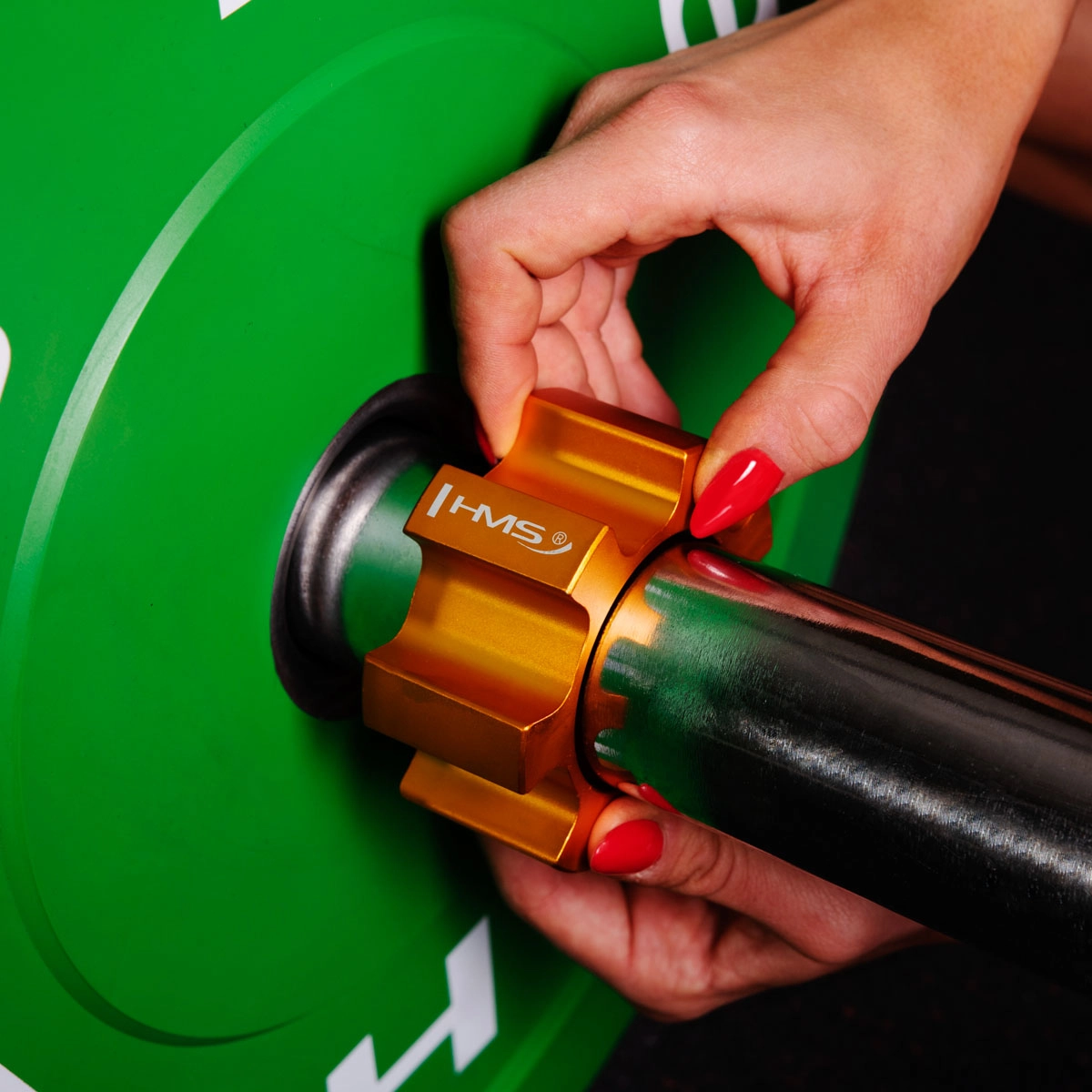 Prémium zárak 50 mm átmérőjű olimpiai rúdhoz elegáns arany színben, HMS ZG1500, amelyek maximális biztonságot és a tárcsák stabilitását biztosítják. A speciális gyorsrögzítő rendszernek köszönhetően könnyen és gyorsan fel- és levehetők, szerszám nélkül és a rúd sérülése nélkül. A tartós alumínium konstrukció ideális intenzív edzéshez otthon és az edzőteremben is.