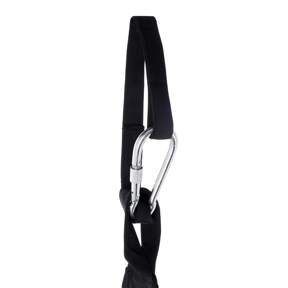 Tartós nejlon hevederek fém karabinerekkel gondoskodnak az erős felfüggesztésről a legtöbb húzódzkodó rúdra és szerkezetre, mindössze néhány másodperc alatt.
