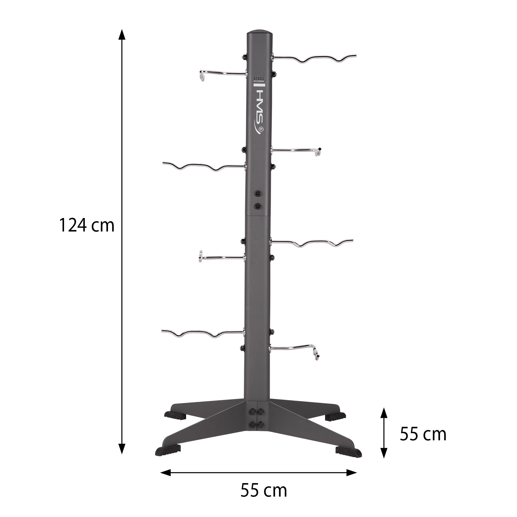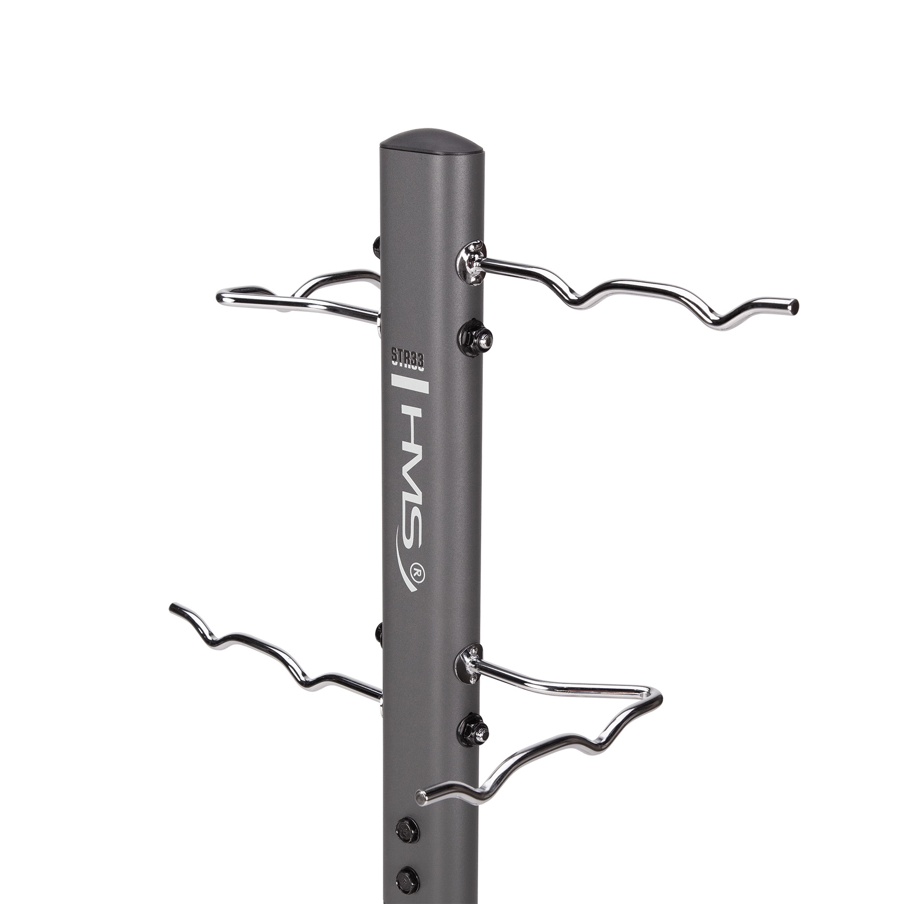 A HMS STR33 kiegészítőtartó állvány okos megoldás a fitnesz kiegészítők rendszerezésére. A robusztus acél szerkezet széles talppal nagy stabilitást nyújt, míg a nyolc kampó, kampónként akár 30 kg teherbírással, több tartozék egyidejű elhelyezésére alkalmas. Az átgondolt kampóforma biztos függesztést tesz lehetővé, így a felszerelés mindig kéznél marad.