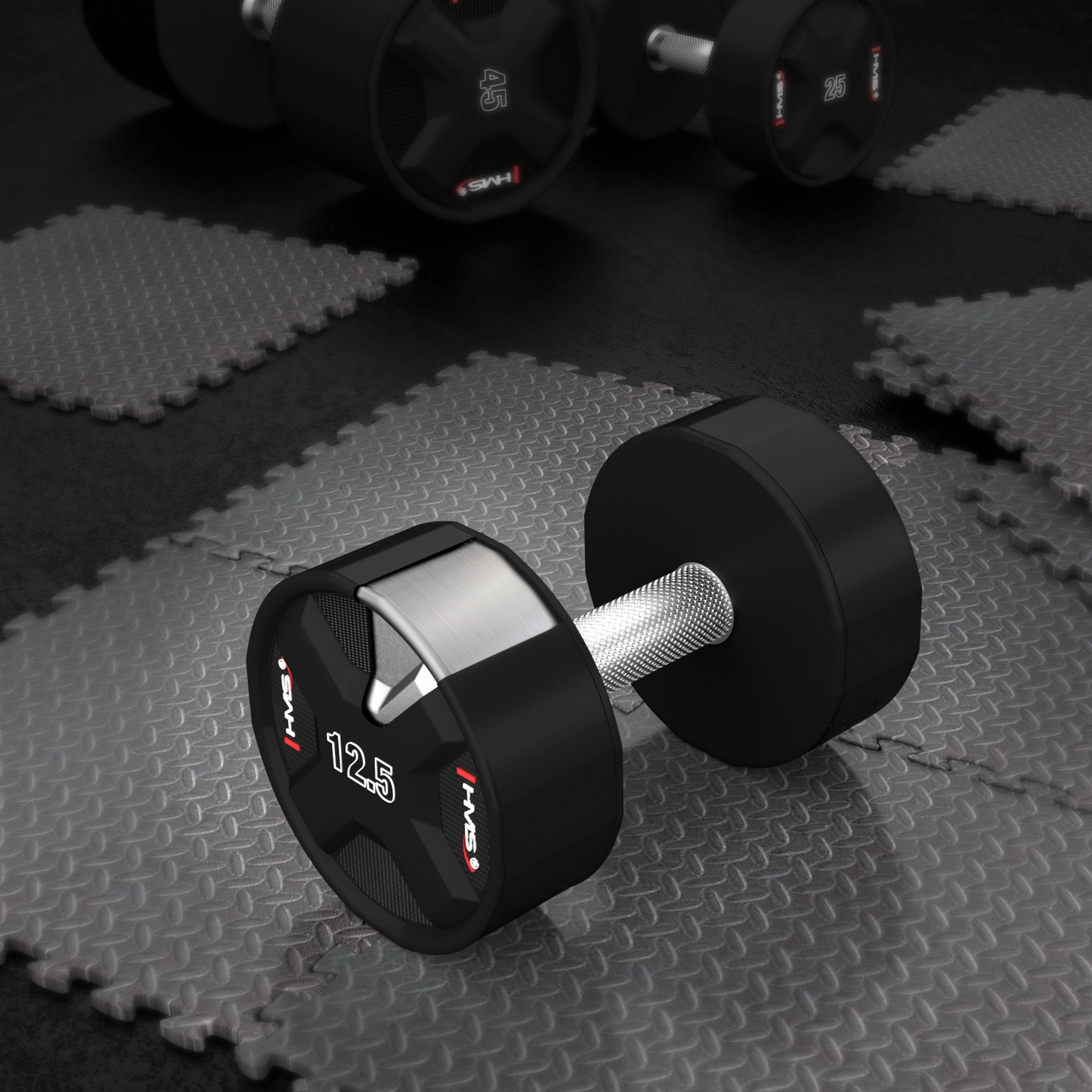 A 12,5 kg-os modell illeszkedik a teljes HMS sorozatba 2,5-től 50 kg-ig 2,5 kg-os lépésekben – ideális a terhelés rendszeres növeléséhez.