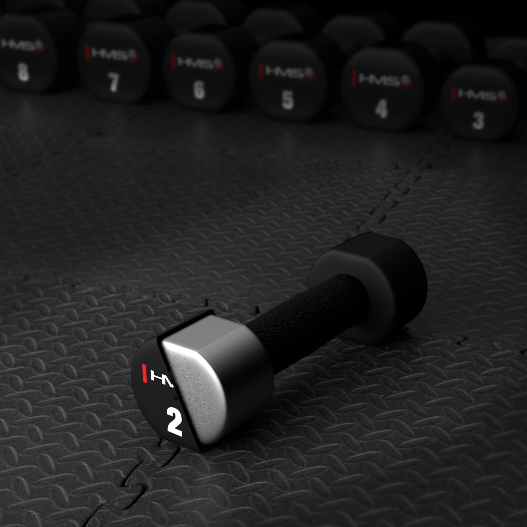 A HMS HPT minőségi egykezes súlyzók acél maggal és fekete termoplasztikus poliuretán (TPU) réteggel, amely hosszú élettartamot, ütés- és kopásállóságot biztosít, miközben kíméli a padlót. A recézett, ergonomikus fogás intenzív edzésnél is biztos tartást ad.