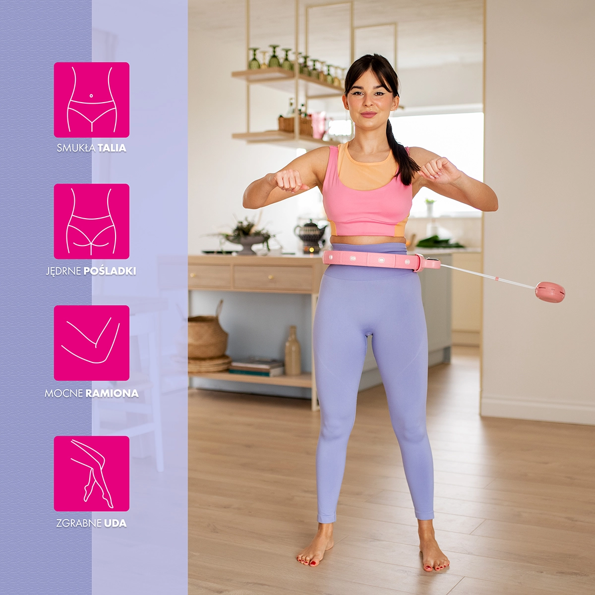 A klasszikus hullahoppal szemben ez a karika nem esik le, stabilan a helyén marad, a zsinóron lévő súly pedig centrifugális ellenállást hoz létre az intenzívebb edzéshez. Rendszeres használata segít karcsúsítani a derekat, formálni a hasat, a combot és a farizmokat, valamint javítani a fittséget. A minőségi PVC és ABS felület tartósságot és hosszú élettartamot biztosít.