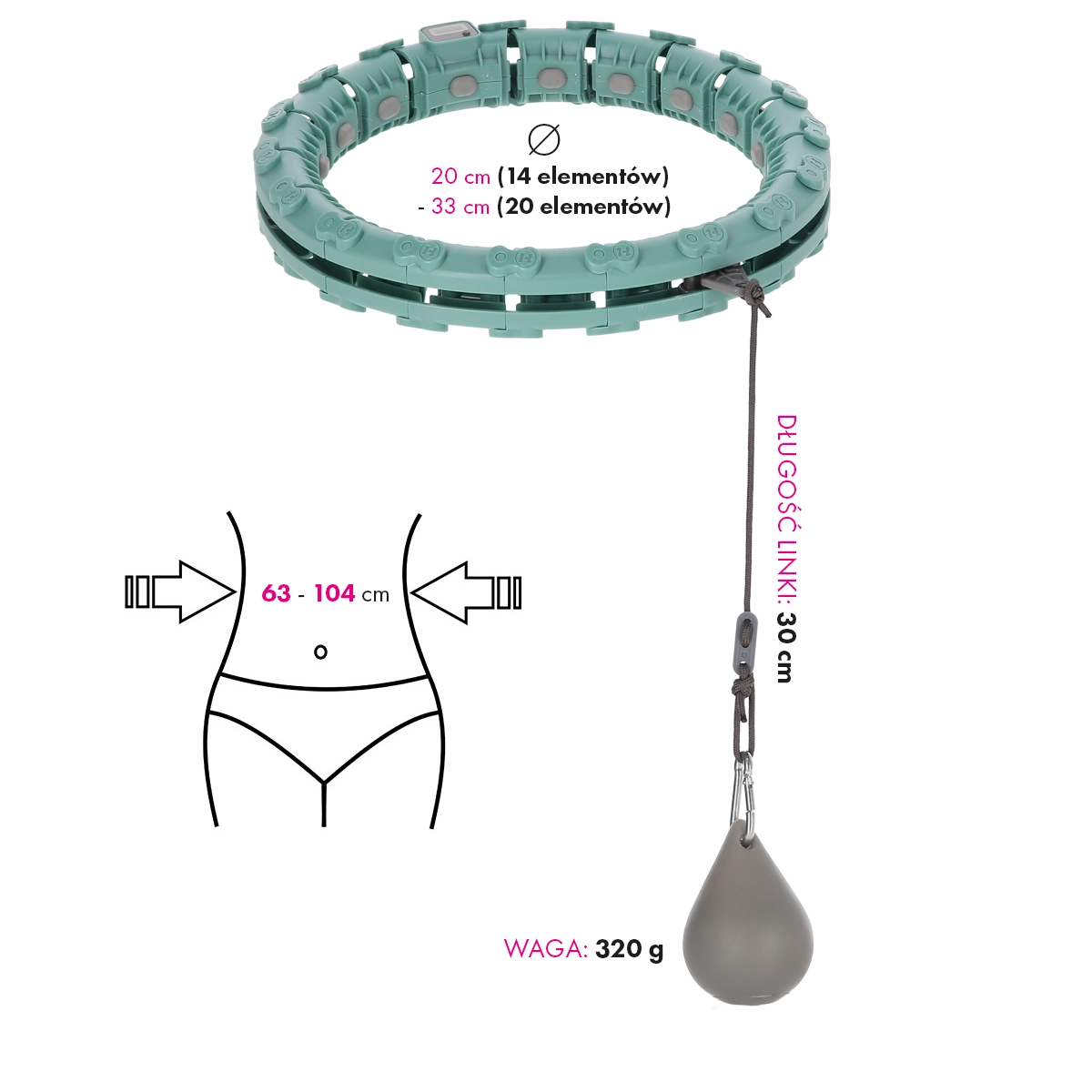 Az okos masszázskarika kényelmes és hatékony kalóriaégetésre készült otthoni környezetben. A 20 elemből álló szegmenses kialakítás lehetővé teszi a derékbőség pontos beállítását 63–104 cm között, így a karika a helyén marad, és nem esik le a csípőről. A belső masszázs kiemelkedések csillapítják a rezgéseket, és kellemesen masszírozzák a törzset.