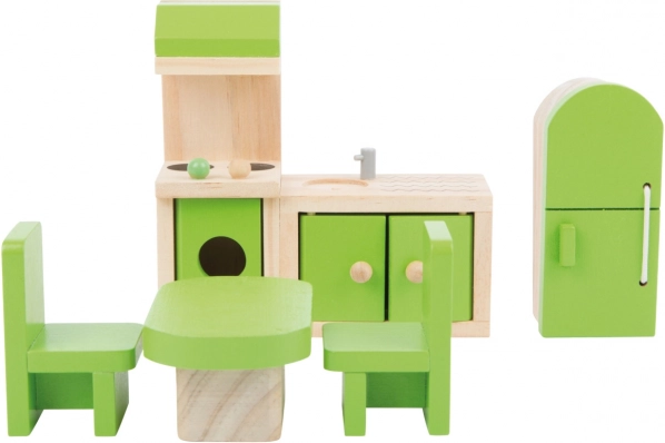 Ez a részletgazdagon kidolgozott konyhakészlet mindent kínál, amire a kis szakácsoknak szükségük van – mosogató, tűzhely, hűtő, asztal és két szék, kellemes, természetes fa és friss zöld akcentusok kombinációjában. A tömör faanyag stabilitást biztosít, készen áll a mindennapos játékra.