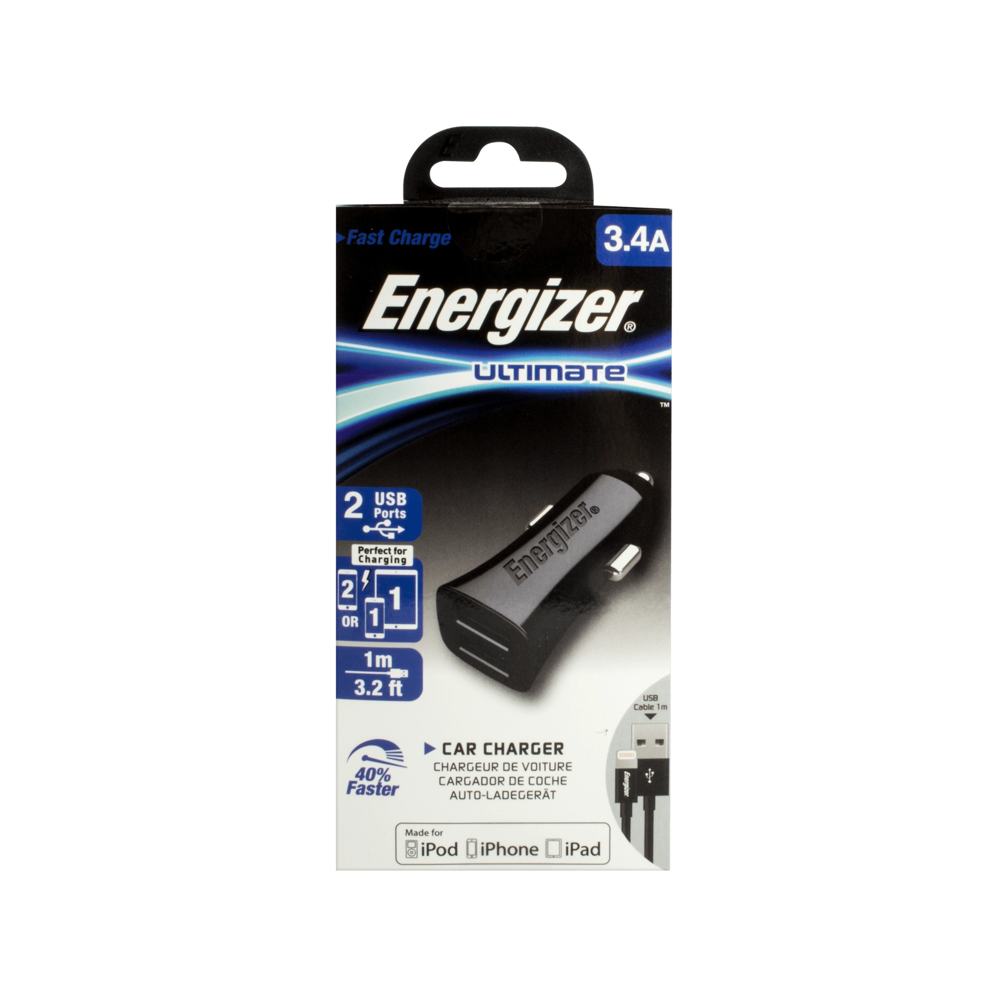 Nagy teljesítményű és biztonságos autós töltő a Energizer márkától, 3,4 A kimenettel és két USB porttal, amely gyors és megbízható töltést biztosít akár két eszköz egyidejű töltéséhez. Az összesen 17 W teljesítmény ideális okostelefonokhoz és tabletekhez, beleértve az Apple eszközöket is.