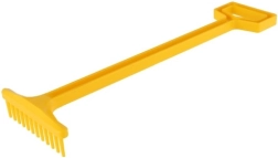 Hosszú nyél és formázott vég a stabil tartásért, homok vagy lomb gereblyézése közben is.