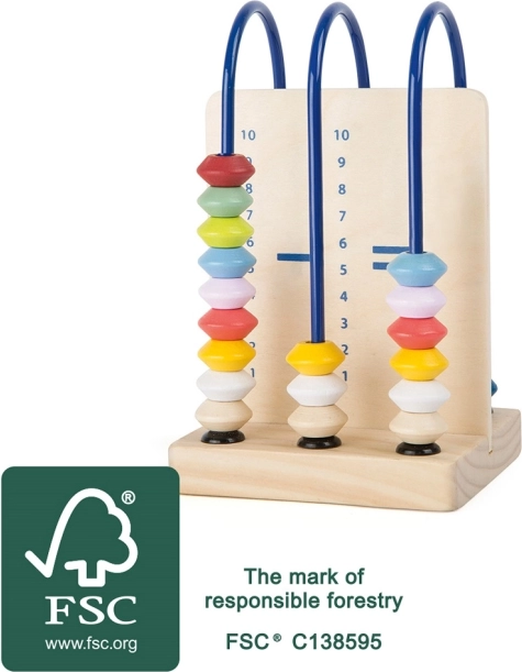 A kompakt és tartós, 100% FSC tanúsított fából készült abakusz ideális matematikai játék utazáshoz és iskolába. A színes gyöngyök támogatják a számok 10-ig való tanulását, fejlesztik a finommotorikát, és szórakoztatóvá teszik a számolást. A praktikus utazási méretnek köszönhetően bármelyik iskolatáskába belefér.