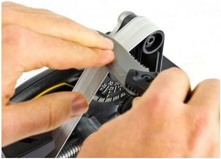 A masszív fémkonstrukció, a simán futó vezetőgörgők és a szögvezető következetes, megismételhető eredményeket biztosítanak. A nagyobb szalagos érintkezési felület segít egyenletes fazettákat és sima köszörülést létrehozni, legyen szó konyhai, kültéri vagy munkakésekről.