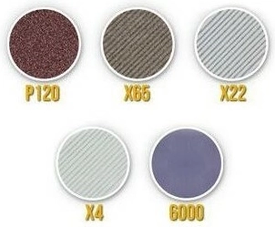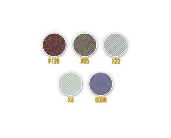 - Széles szemcsetartomány: P120 a gyors élkiegyenlítéshez, X65 és X22 a formázáshoz, X4 az előpolírozáshoz, P6000 a végső polírozáshoz.