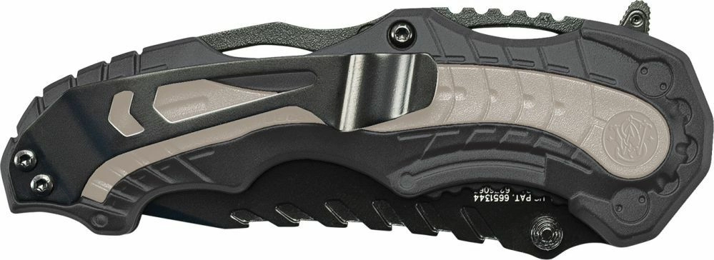 Univerzális EDC kés, a SMITH & WESSON M&P asszisztált nyitású M.A.G.I.C. mechanikával, robusztus Tanto típusú 4034 rozsdamentes acél pengével fekete felületkezeléssel, részben fogazott éllel (40%) és megbízható Liner Lock zárral. Az alumínium markolat gumibetétjei biztos fogást adnak, a zsebklipsz és a üvegtörő vészhelyzetben is hasznos kiegészítő.