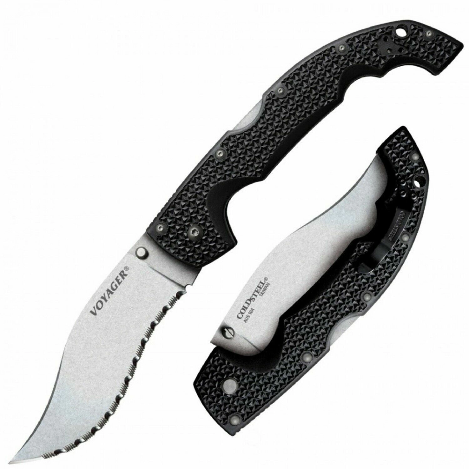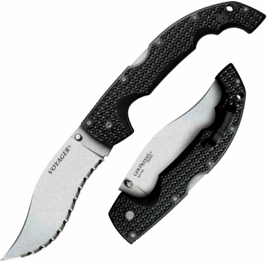 A Cold Steel Extra Large Voyager Vaquero Serrated masszív, mégis könnyű zárókés agresszív Vaquero pengevonallal, amely kiválóan teljesít vágásnál és aprításnál is. A fogazott élnek és a tartós AUS10A acélnak köszönhetően a keményebb anyagokkal is megbirkózik, és hosszú ideig megőrzi az élét. A Stonewash felület csökkenti a karcolások láthatóságát, és növeli a tartósságot a mindennapi használat során.