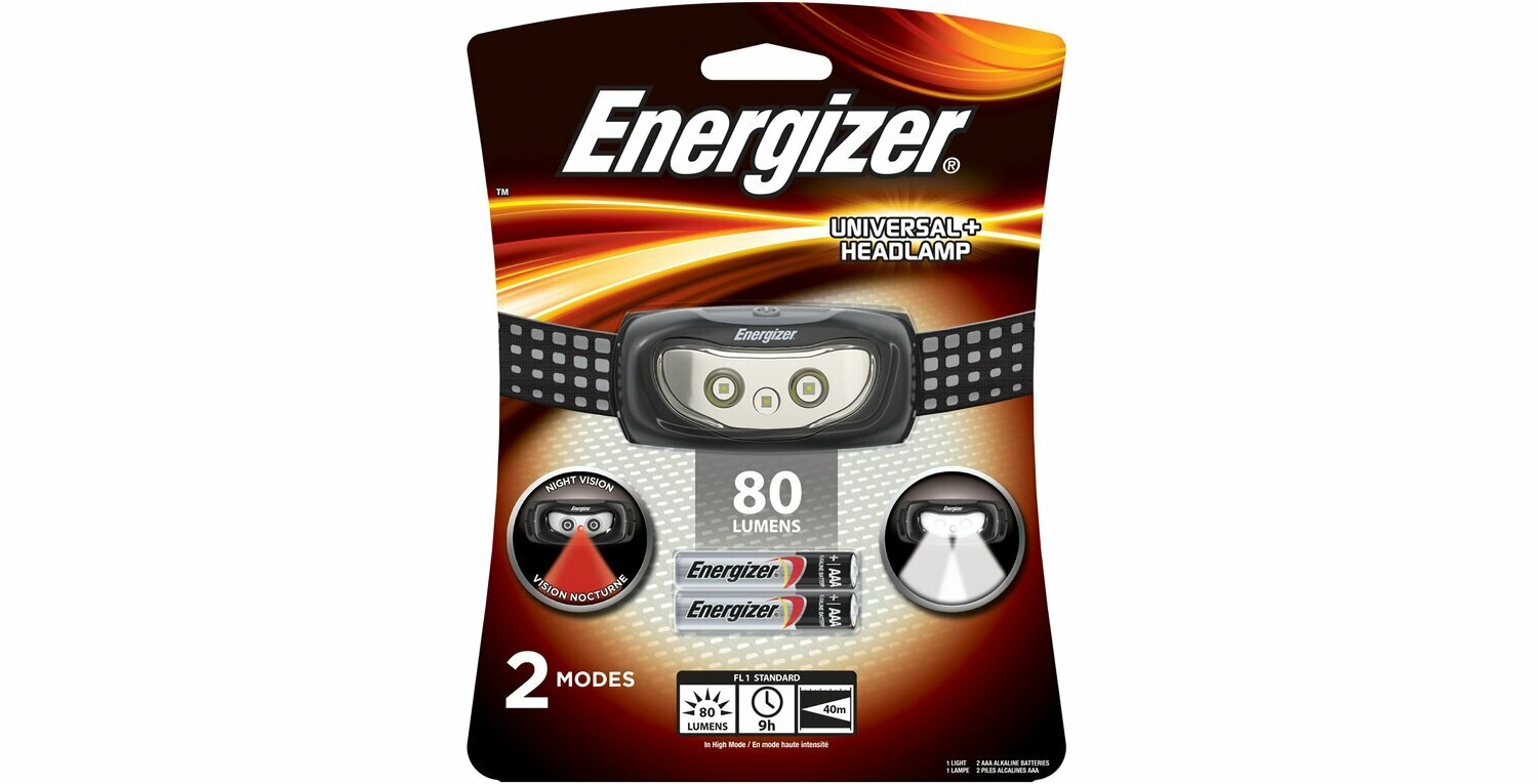 A praktikus Energizer Universal Plus fejlámpa megbízható társ minden esti kalandhoz. A 2× fehér LED fővilágításra és a piros LED kíméletes éjszakai látáshoz vagy figyelmeztető jelzéshez biztosítja a biztonságot és a kényelmet. A 80 lumenes fényáramnak és az akár 40 méteres hatótávnak köszönhetően terepen és úton is jól láthat.
