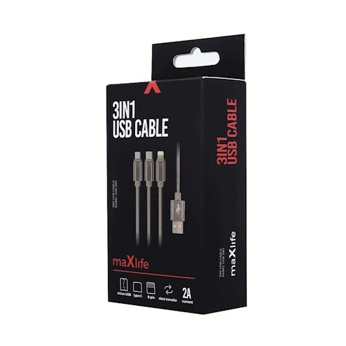A Maxlife univerzális 3 az 1-ben kábele tartós nejlonfonattal három csatlakozót kínál – Lightning, USB‑C és microUSB – így egyetlen kábellel több eszközt is tölthet. Támogatja a gyors töltést 2,1 A áramerősséggel, rugalmas, és a fém csatlakozóházaknak köszönhetően rendkívül tartós.