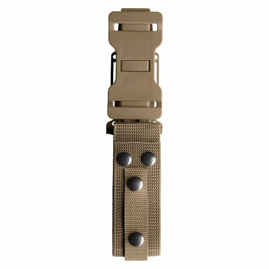 Az ergonomikus, coyote színű FRN markolat gyémánt mintázattal biztonságos és kényelmes fogást nyújt nedvesen vagy kesztyűben is. Az alsó részen zsinórlyuk és praktikus üvegtörő található vészhelyzetekre. A csomag tartalmaz egy tartós, kemény műanyag és nejlon tokot, amely MOLLE-kompatibilis, és lehetővé teszi a vízszintes és függőleges rögzítést övre, hátizsákra vagy taktikai mellényre.