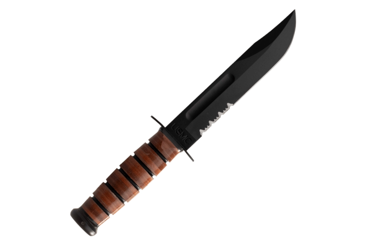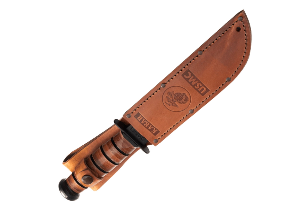 A második világháború óta ikonná vált a legendás, fix pengéjű KA-BAR USMC kés. Részben fogazott élével hatékonyan vág köteleket és hevedereket, 1095-ös acélból készült, fekete bevonatú pengéje nagyfokú tartósságot nyújt, míg a bőr markolat biztos fogást garantál. A csomag része egy minőségi bőr tok a biztonságos hordáshoz.