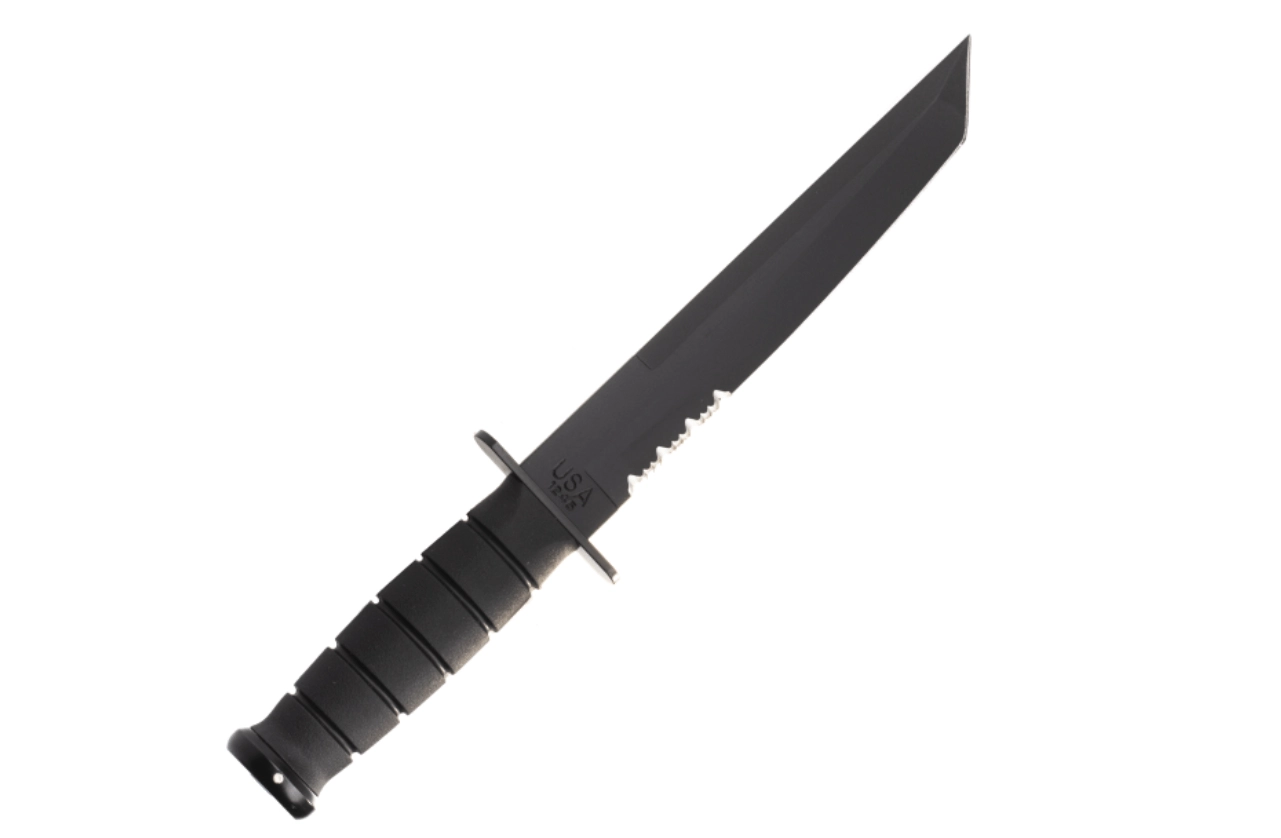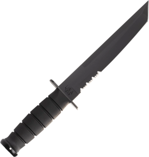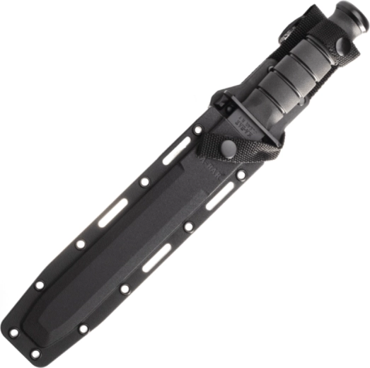 Ez a taktikai kés a legendás U.S.M.C. KA-BAR mintából merít, és megbízható teljesítményre készült megterhelő körülmények között. A fekete bevonatú Tanto penge kiváló behatolást és erős csúcsállóságot kínál, míg a részben fogazott él hatékonyan vág köteleket, hevedereket és durvább anyagokat. Az ergonomikus Kraton markolat biztos, nem csúszó fogást ad még nedvesen is.