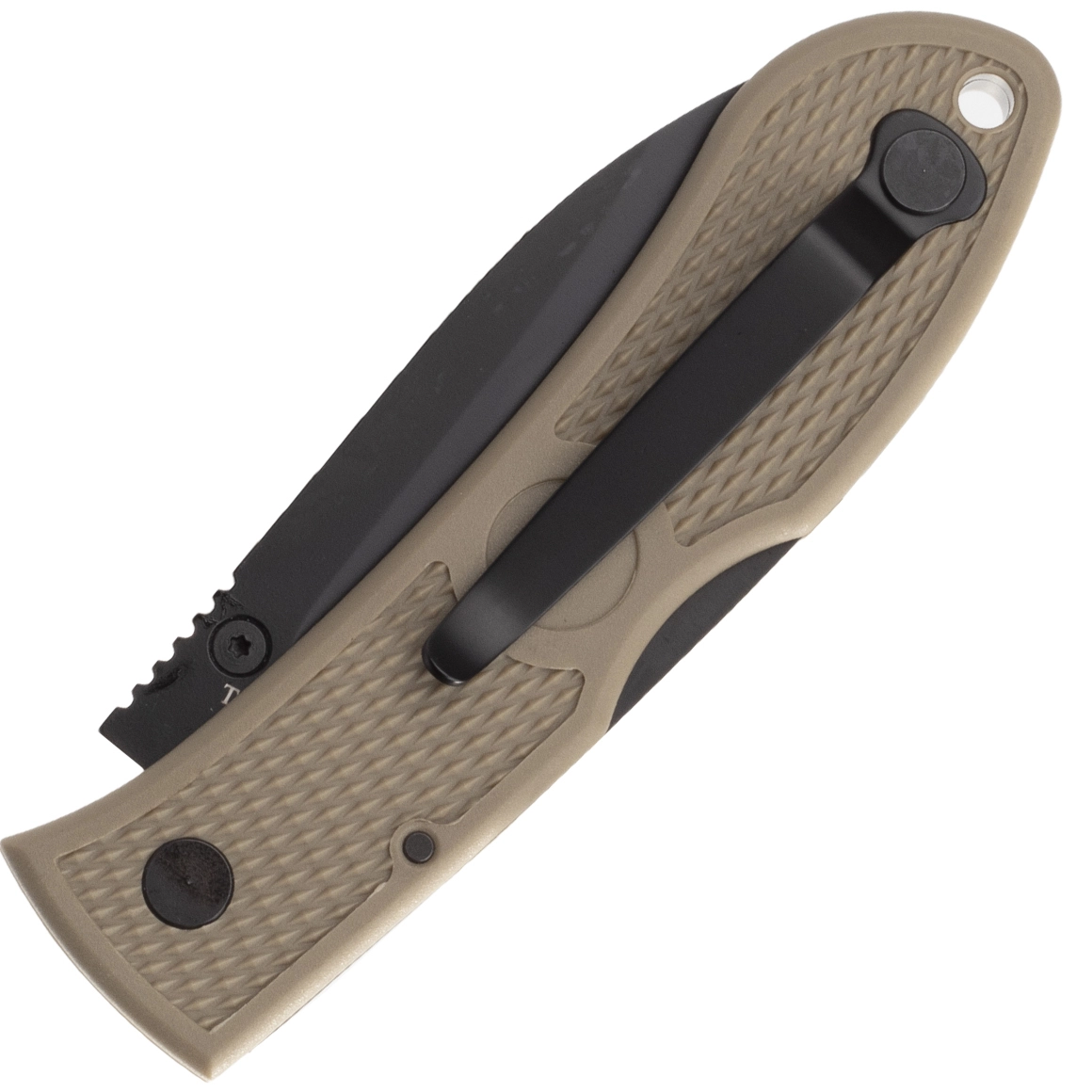 A Coyote Brown árnyalatú, textúrázott Zytel markolat biztos fogást ad még nedvesen is. A praktikus nyitószeg lehetővé teszi az egykezes nyitást, a zsebre csíptethető klip átszerelhető a másik oldalra, a zsinórlyuk pedig bővíti a hordási lehetőségeket. Remek EDC megoldás városba, munkába és kirándulásokra.