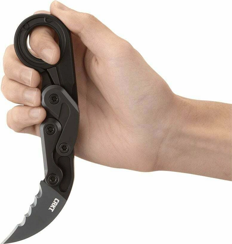 A speciális Veff fogazás jelentősen növeli a vágási teljesítményt szálas anyagokon, míg a karambit gyűrű biztos fogást és teljes kontrollt ad. A 6061-T6 repülőipari alumínium markolat formázott zsebklipekkel, melyek könnyű hüvelykujjas nyomással aktiválhatók, támogatja a kényelmes rejtett hordást és a gyors előrántást.