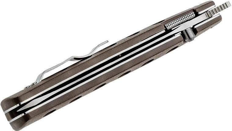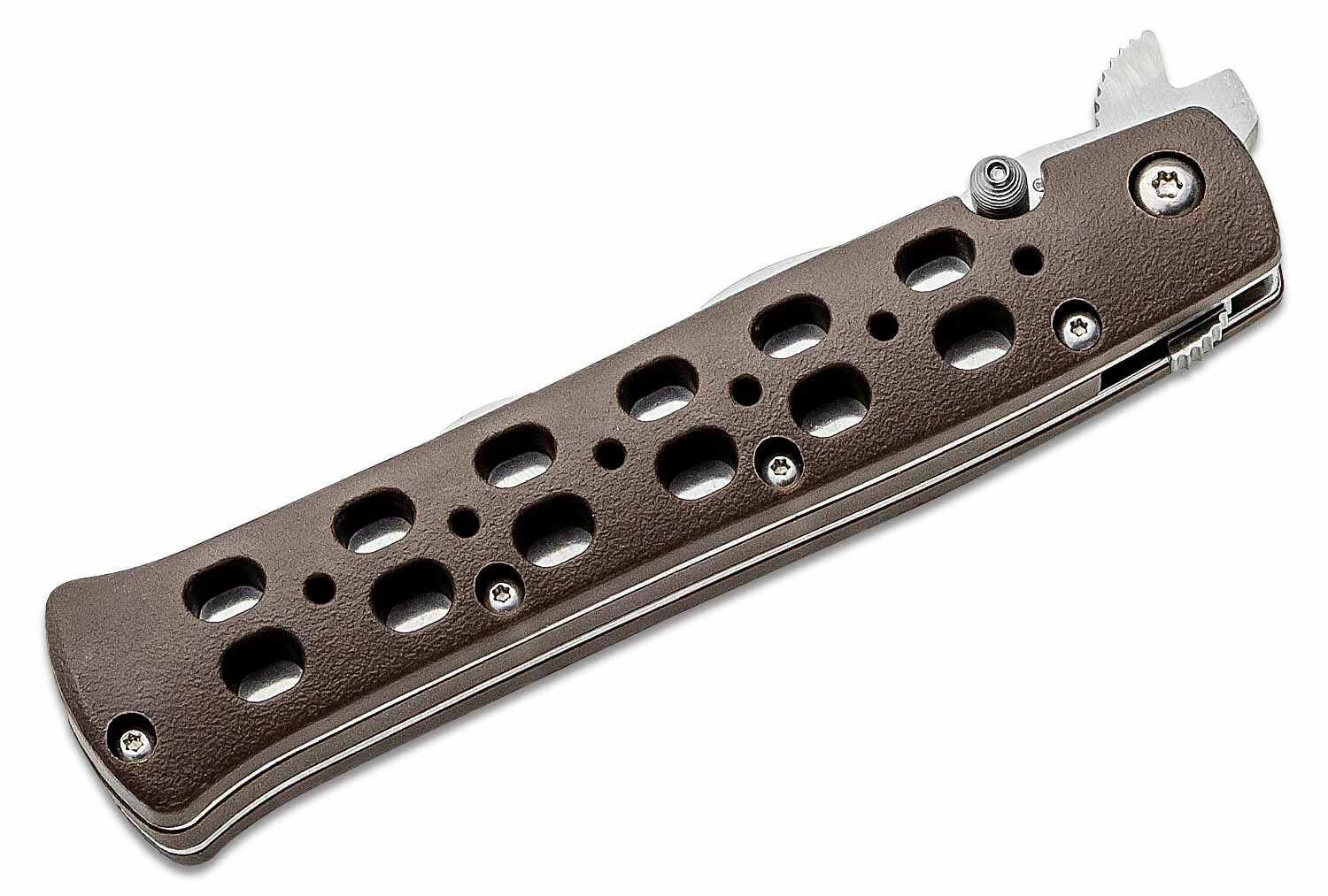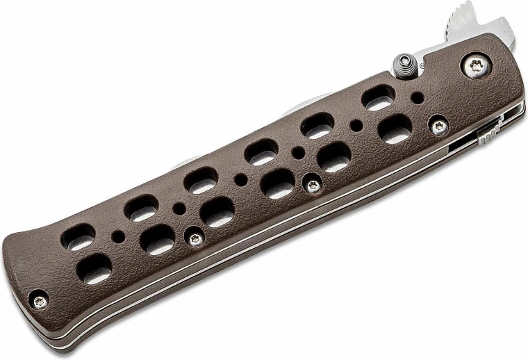 A AUS-10A japán rozsdamentes acélból, szatén csiszolással készült penge kiváló egyensúlyt nyújt élmegtartás, szívósság és korrózióállóság között. A szerkezet a Cold Steel erős rugós zárát alkalmazza, kb. 66 kg terhelhetőséggel, így igényes feladatoknál is számíthat a biztonságra. Az ergonomikus, barna Zy-Ex markolat könnyű, merev és kellemesen textúrált a biztos fogásért.