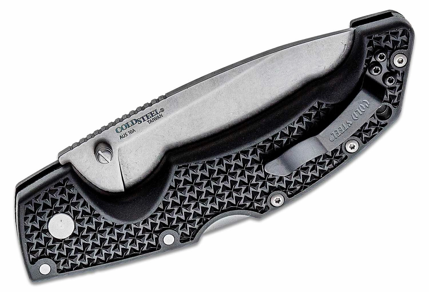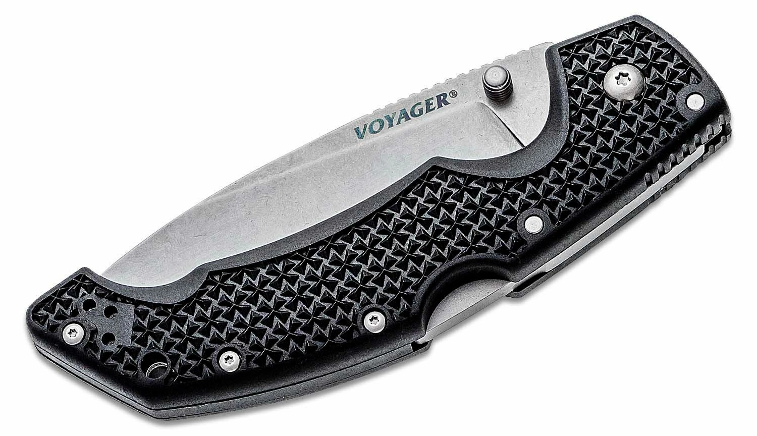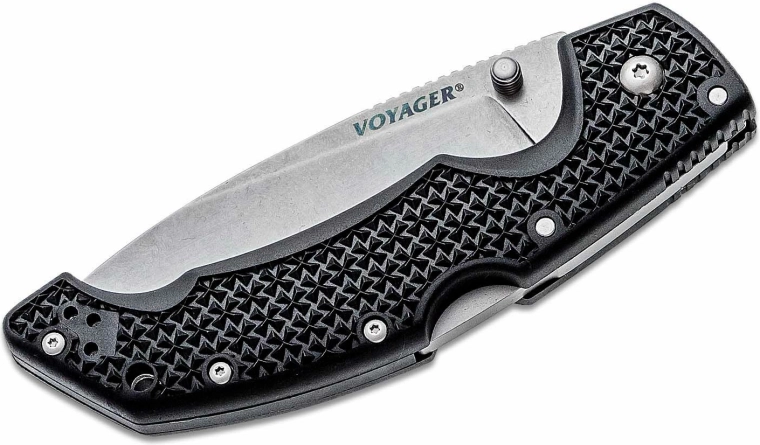 A Cold Steel Voyager Large Drop Point univerzális zsebkés megbízható választás vadászathoz, túrázáshoz és mindennapi hordáshoz. AUS10A japán acél pengét kínál stonewash felületkezeléssel, biztonságos Tri-Ad Lock zárral, hüvelykujjas nyitószeggel a gyors nyitáshoz, valamint könnyű, mégis tartós Griv-Ex markolattal és zsebkappal.