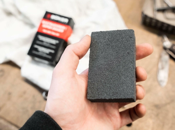 Praktikus csiszoló radír, a Böker Super Eraser, amely gyorsan és kíméletesen távolítja el a foltokat, patinát és rozsdát a fém felületekről. A 240-es szemcseméretnek köszönhetően hatékonyan csiszol, tisztít, simít és políroz, különösen a szénacél pengéken, ahol visszaállítja a tiszta megjelenést az anyag sérülése nélkül.