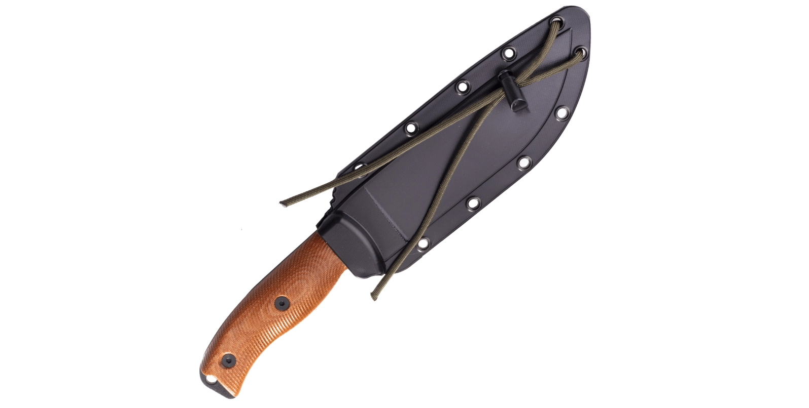 Az ergonomikus, Micarta markolat érdesebb textúrája biztonságos, csúszásmentes fogást ad még nedvesen is. A teljes tang szerkezet növeli a szilárdságot, a gerincen lévő jimping és a kifejezett finger choil javítja a penge feletti kontrollt a precíz vágásoknál. A csomag része egy kydex tok számos furattal a többpozíciós viseléshez és hátizsákra vagy felszerelésre rögzítéshez.