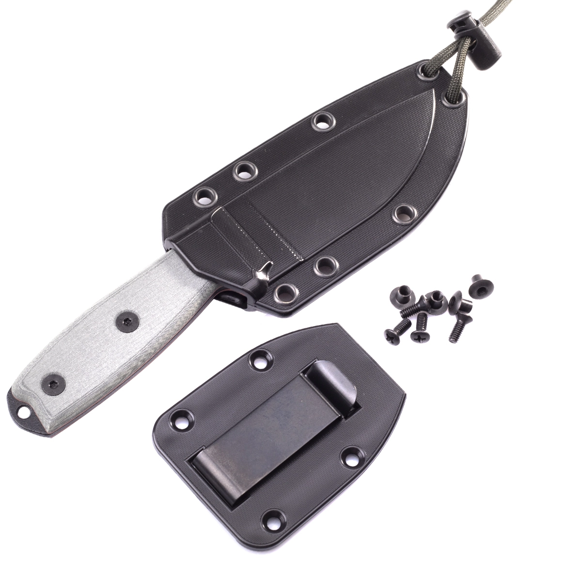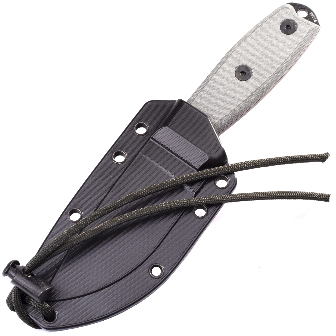 A texturált Micarta markolat biztosan ül a kézben még nedvesen is, és nem hiányzik a biztosító zsinór számára kialakított nyílás sem. A kést egy könnyű és erős Zytel tok egészíti ki, többféle rögzítési lehetőséggel – övre, mellényre vagy hátizsákra – a MOLLE kompatibilitásnak és a mellékelt klipnek köszönhetően.