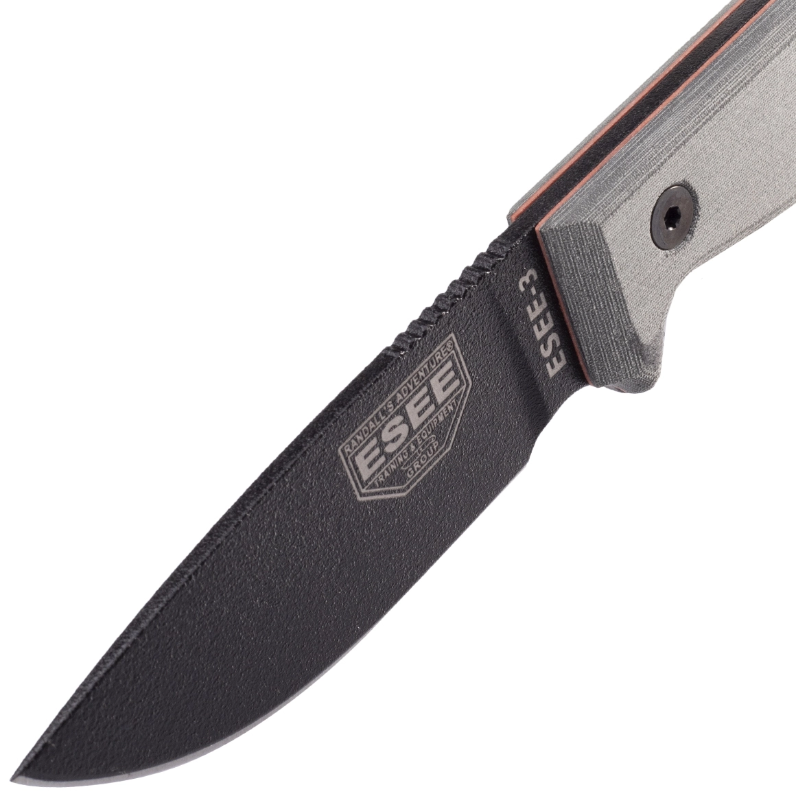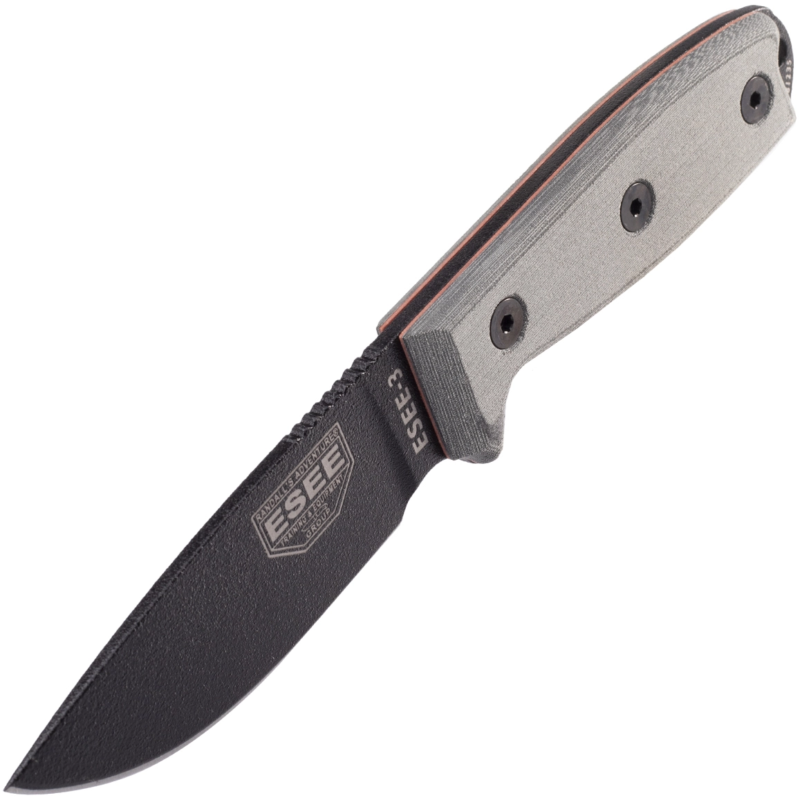 ESEE Model 3 kompakt és megbízható fixpengés kés outdoorhoz, bushcrafthoz és survival feladatokhoz. 1095 szénacél fekete felületkezeléssel, full tang szerkezet a maximális tartósságért és ergonomikus Micarta markolat szürke színben. A csomag része a strapabíró Zytel tok, amely MOLLE kompatibilitásának köszönhetően felszerelésre is rögzíthető.