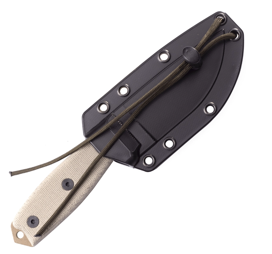 Az ergonomikus Micarta markolat durvább textúrája nedvesen is biztosan tart. A teljes tang szerkezet nagy szilárdságot ad, a kifejezett guard védi az ujjakat, a pántfurat pedig megkönnyíti a biztosítózsinór használatát vagy a felakasztást. A csomag tartalma egy könnyű, mégis erős Zytel tok, több hordási opcióval – övre acél klipszel vagy felszerelésre a kompatibilis MOLLE rendszerrel.
