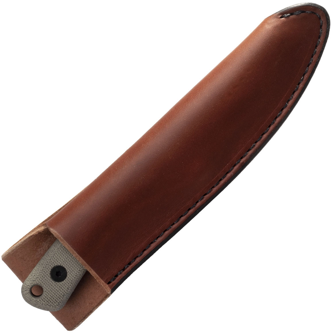 A Micarta markolat szürke, textúrált felülete biztos fogást ad nedvességben is. A teljes tang szerkezet növeli a szilárdságot, a kifejezett ujjvédő megakadályozza a kéz lecsúszását, a zsinórlyuk pedig megkönnyíti a kés rögzítését. A csomag része egy minőségi bőrtok övbújtatóval a biztonságos és kényelmes viselethez.