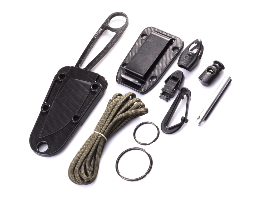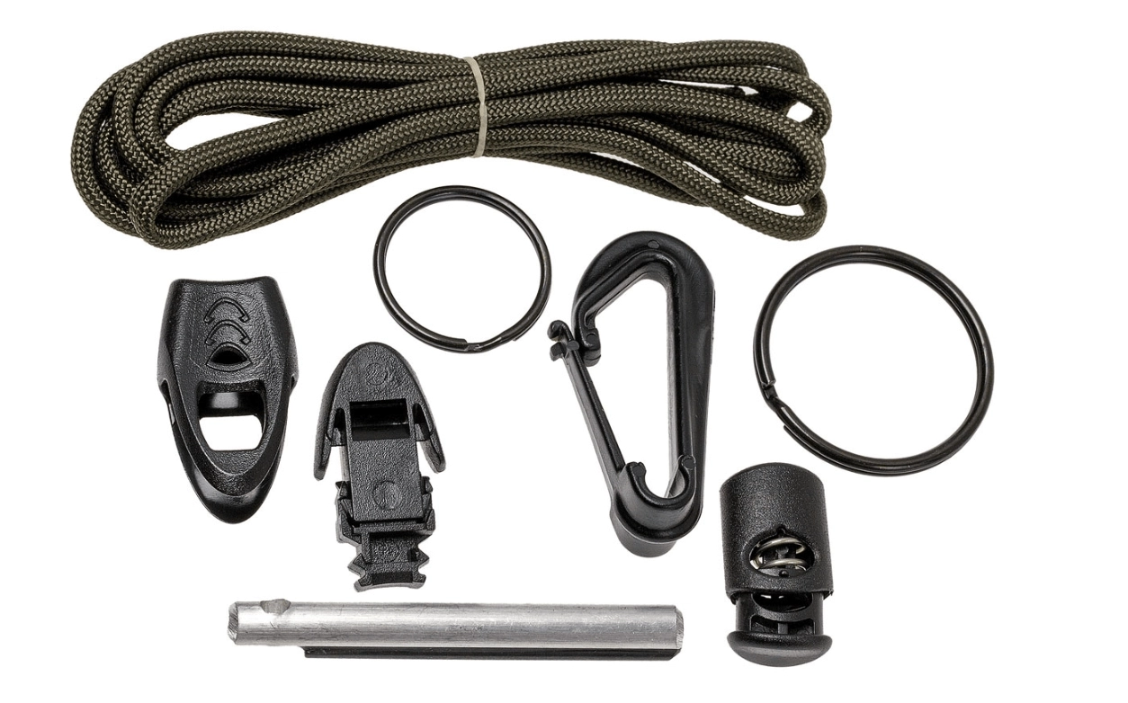 - Tűzgyújtó, paracord, osztógyűrűk, sípot integráló klipsz, karabiner