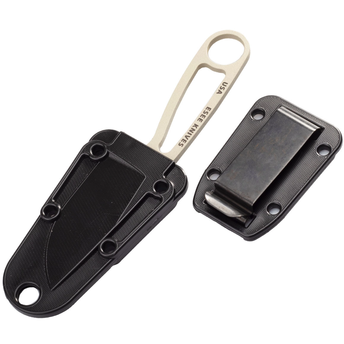 A fekete műanyag tok fém csipesszel stabilan tartja a kést, és többféle hordási módot tesz lehetővé a gyors hozzáférésért.