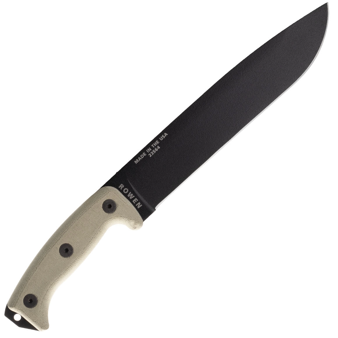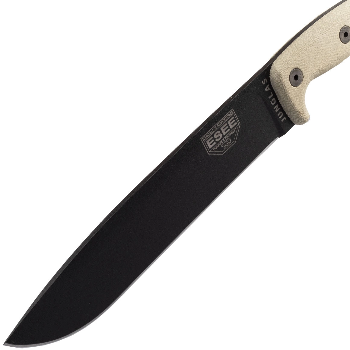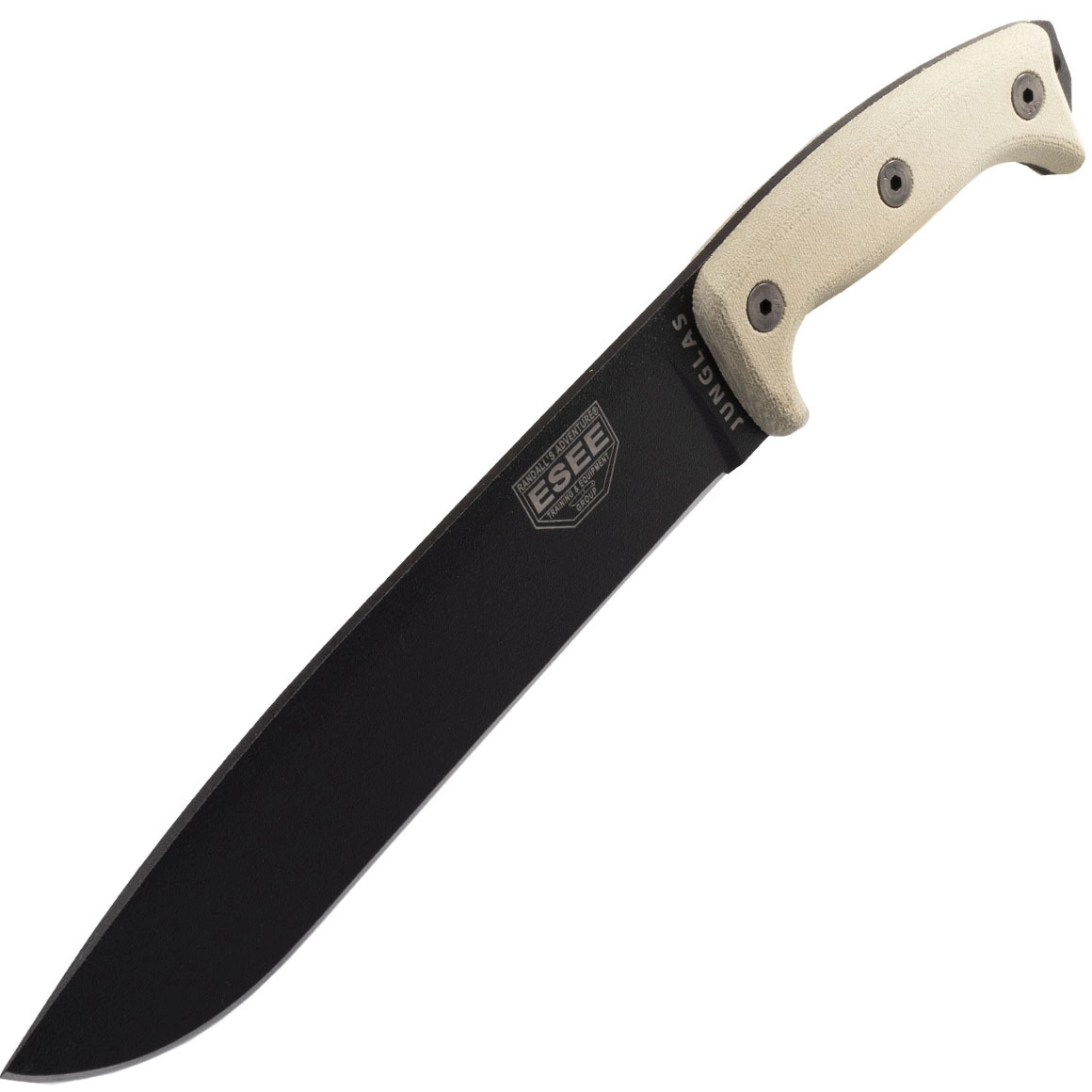 Az ESEE JUNGLAS-E machete kalandorok, bushcrafterek és profik eszköze. Az erős, fekete bevonatú 1095-ös szénacél penge kiválóan vág, aprít és utat tör a növényzetben. A teljes tangos felépítésnek köszönhetően rendkívül tartós és megbízható kemény munkánál is. A Micarta markolat homokbarna árnyalatban remekül kézre áll, nem csúszik, végén zsinórfuratot és könnyű kopogtatásra alkalmas gombot kínál.