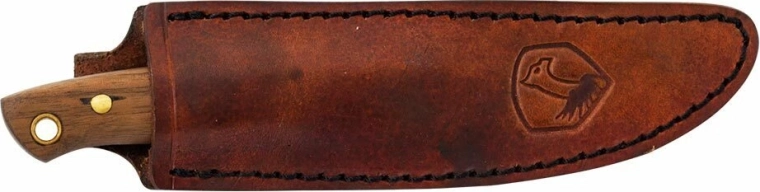 A diófa markolat kézre áll, biztos fogást ad, a végén pedig praktikus zsinórlyuk található. A biztonságos hordáshoz a csomag része a minőségi bőrtok, amely védi a pengét és kényelmes övhordást tesz lehetővé.